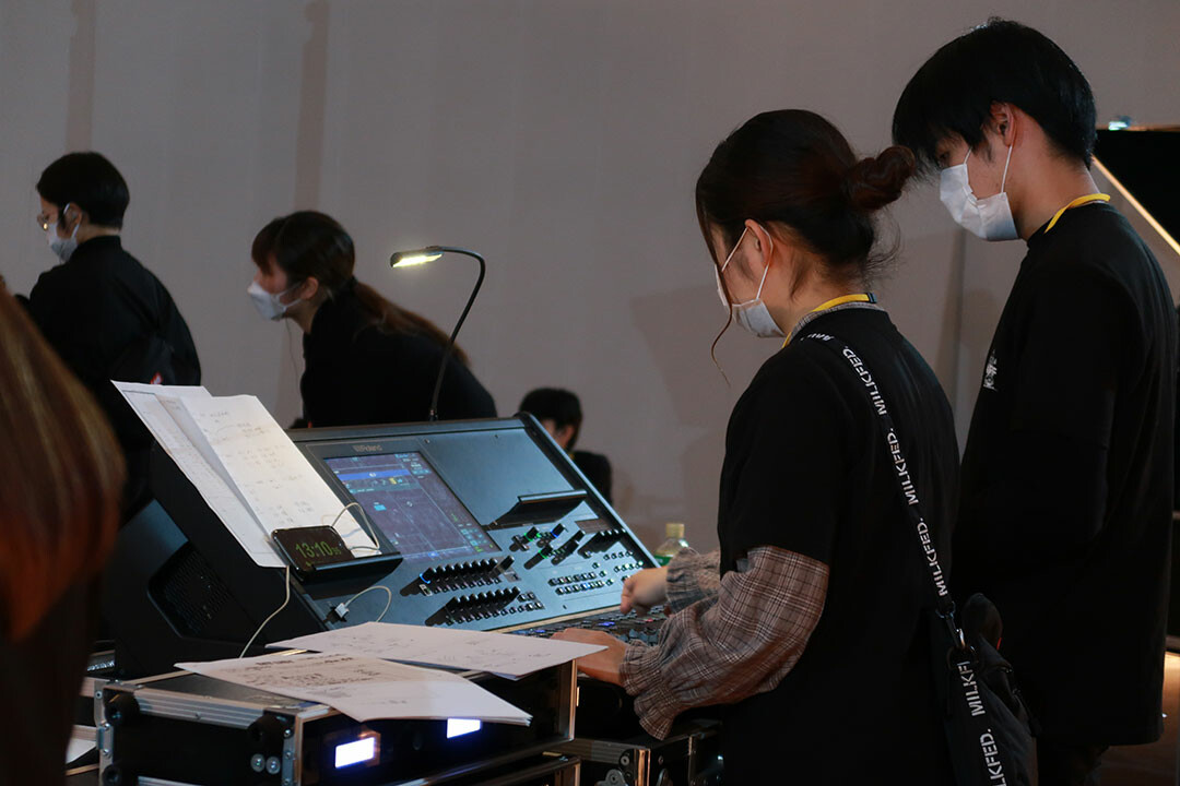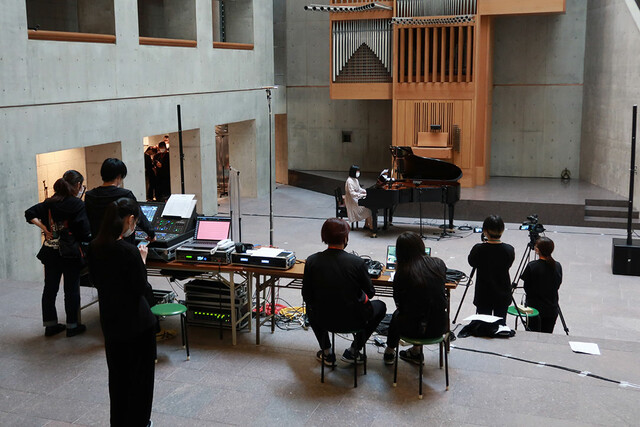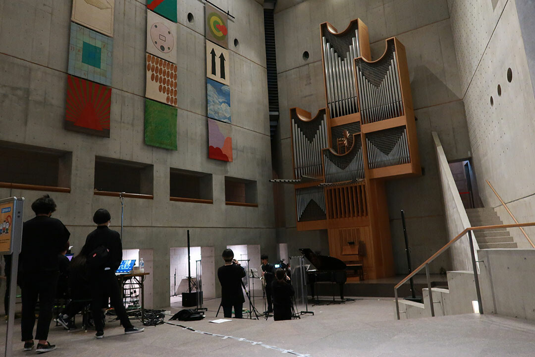 アートホールは美しく、他にはない不思議な音響効果を持つ空間です。授業で作曲したものを、演奏学科の協力のもと生演奏しました。また、配信イベントという特徴を生かし、授業内で制作したミュージックコンクレートに映像を加え配信。転換という待ち時間を撤廃するという事にも挑戦しました。