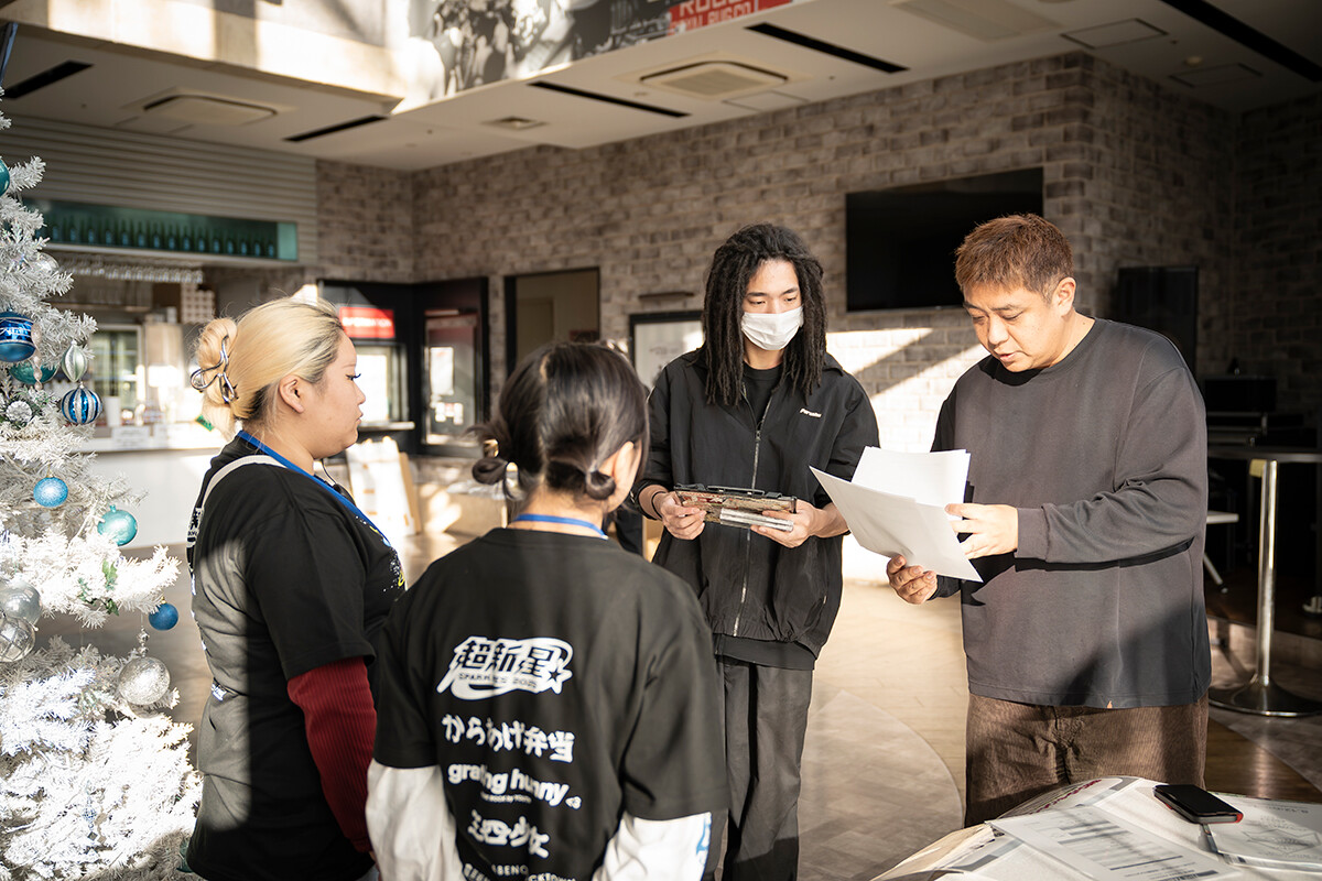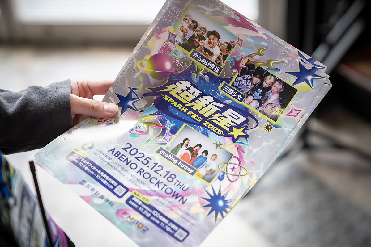 イベントの運営チームは3年生と2年生で構成され、開催の約半年以上前から本格的な準備が始まりました。イベントタイトルにある「超新星」とは、真っ暗な夜空で突然強く明るく輝く星を指し、「その日、その時にしか見られない、人生の起点になる光を提供したい」という想いを込めて命名されました。出演者の選定は、普段からライブハウスに通っている学生たちの情報をもとに、客層のメインである高校生に人気のアーティストを候補として提案。最終的に「からあげ弁当」と、本学学生が在籍する「grating hunny」「三四少女」という3組が決定しました。