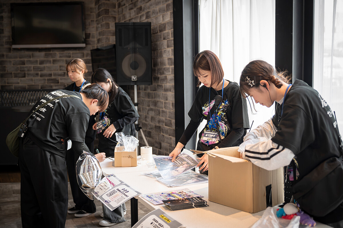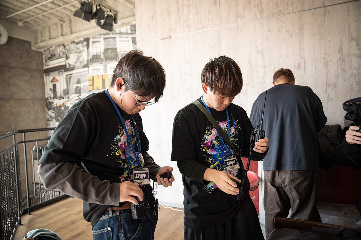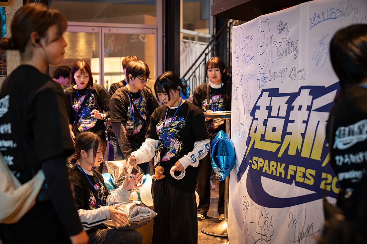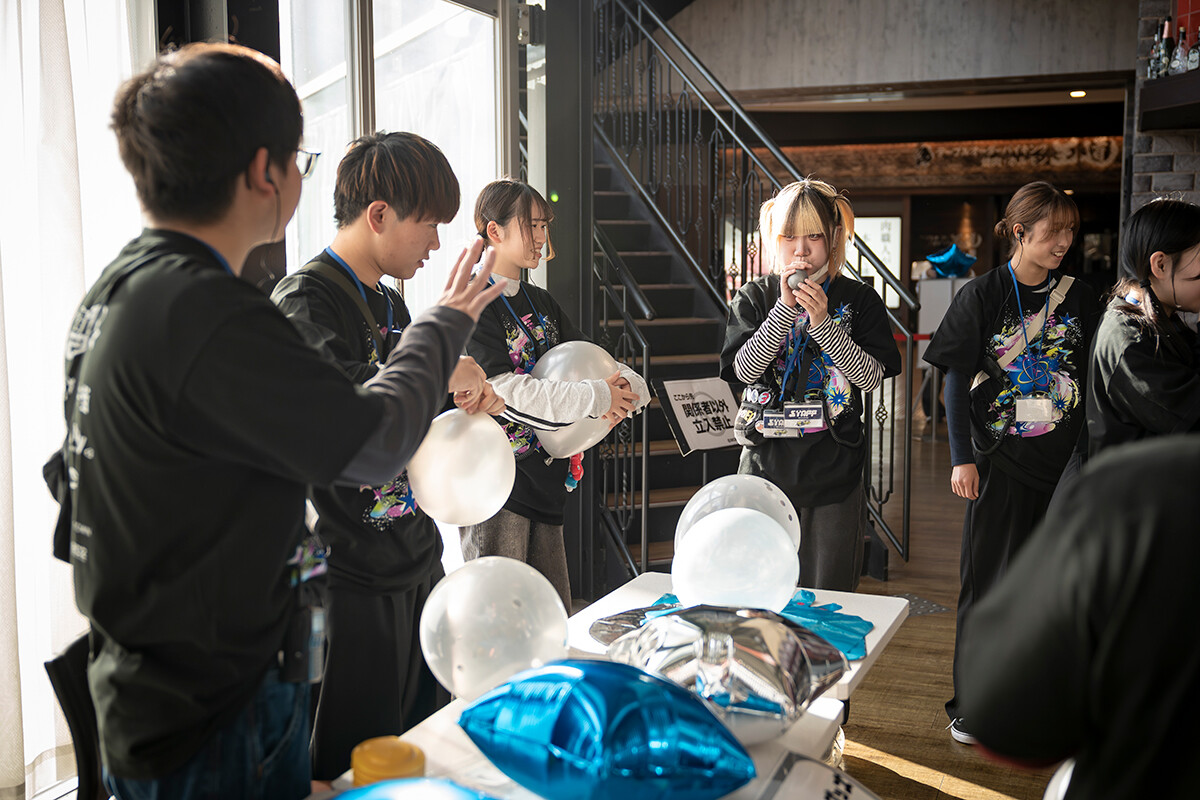 場内ではグッズの販売ブースの設置や楽屋周りのセッティング、動画撮影の打ち合わせ、バルーンによるデコレーションも行われ、来場者を出迎える体制が整っていきます。開場直前にはホール内で今江先生と学生たちによる最終ミーティングが行われ、チーム内で緊張感と期待感が高まっていきます。