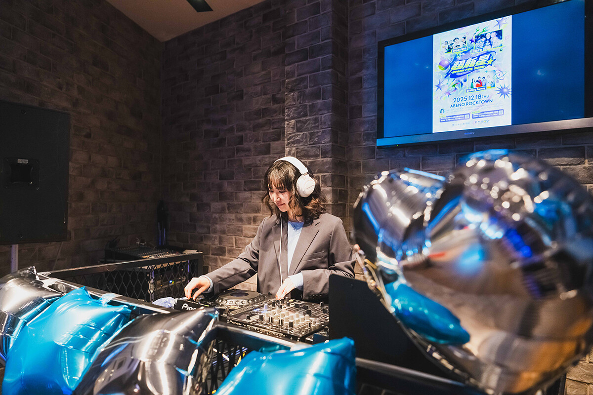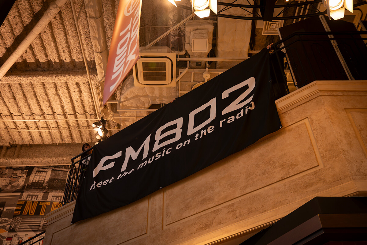 出演アーティストのメッセージが書き込まれた大きなフラッグもフォトスポットとして人気を博していました。FM802のパーソナリティで、本学の卒業生でもある板東さえかさんは、今回、MCだけでなく開演前にロビーでのDJプレイも担当し、場内のムードを盛り上げます。