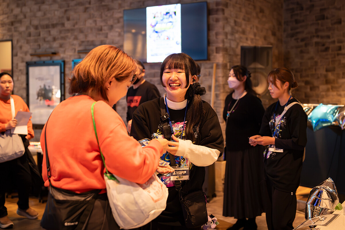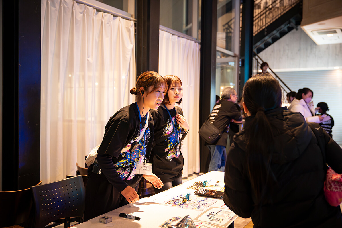 いよいよ迎えたイベント当日。学生たちは到着後、チームのユニフォームであるスタッフTシャツに着替えて会場設営を開始。今回のTシャツデザインは「超新星」というタイトルにちなんで宇宙の星がカラフルに描かれ、来場者からも販売してほしいと要望が入るほどの好評ぶりでした。