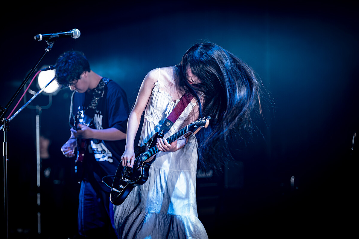 1組目の一回生ゴスペルは演奏学科ポピュラー音楽コース1年生で構成され、ゴスペルでの歌唱を軸にしながらも合間にラップパートをはさむなど多彩に歌唱。2組目の芸短帝国はアコースティックギターの音色の渋い味わいが印象的。冷や汗うどん!は「はっ」と息を吸って歌い出す瞬間から楽曲の世界観が作り込まれていました。続くほうき星はボーカルの演奏学科3年生・中村桃子さんが歌詞の一つ一つの言葉を大切にするように歌い上げ、エレサンライズはヘビーかつ攻撃的な轟音で鑑賞者を熱狂させました。6組目の満月 band setは今回唯一のオリジナル曲での参加で、ボーカルの演奏学科4年生・山本満月さんの静から動へ移り変わっていく演奏表現が特徴的でした。