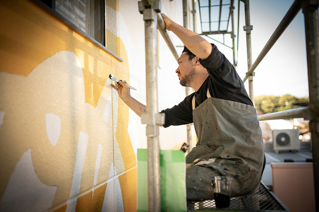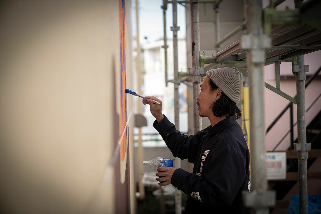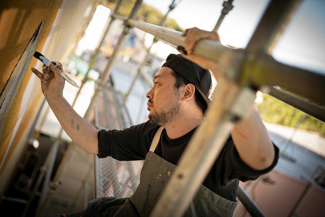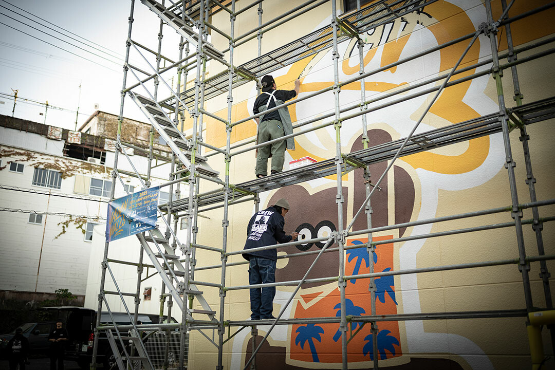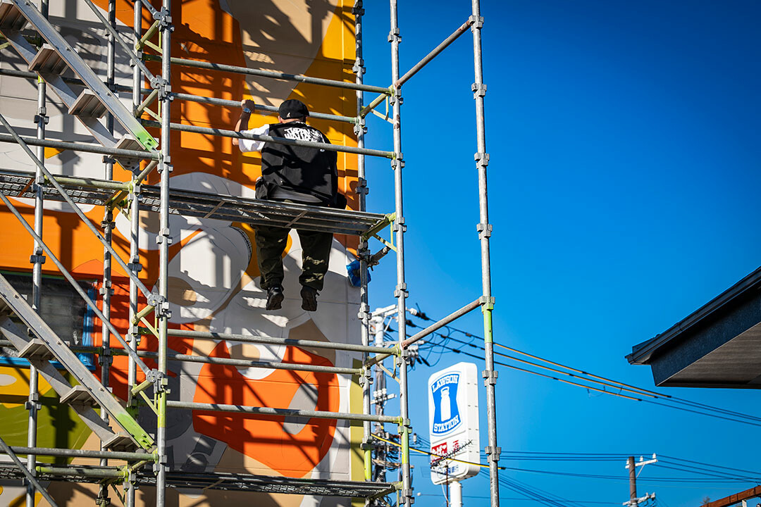 制作をしていると近くに住んでいる人たちが、足場に登って描いている2人を何が出来上がるんだろうと見上げていきます。こうやって「ふだん美術館やギャラリーに足を運ばない人に自分たちの作品を見てもらえるのも壁画制作のやりがいのひとつですね」と松本さん。