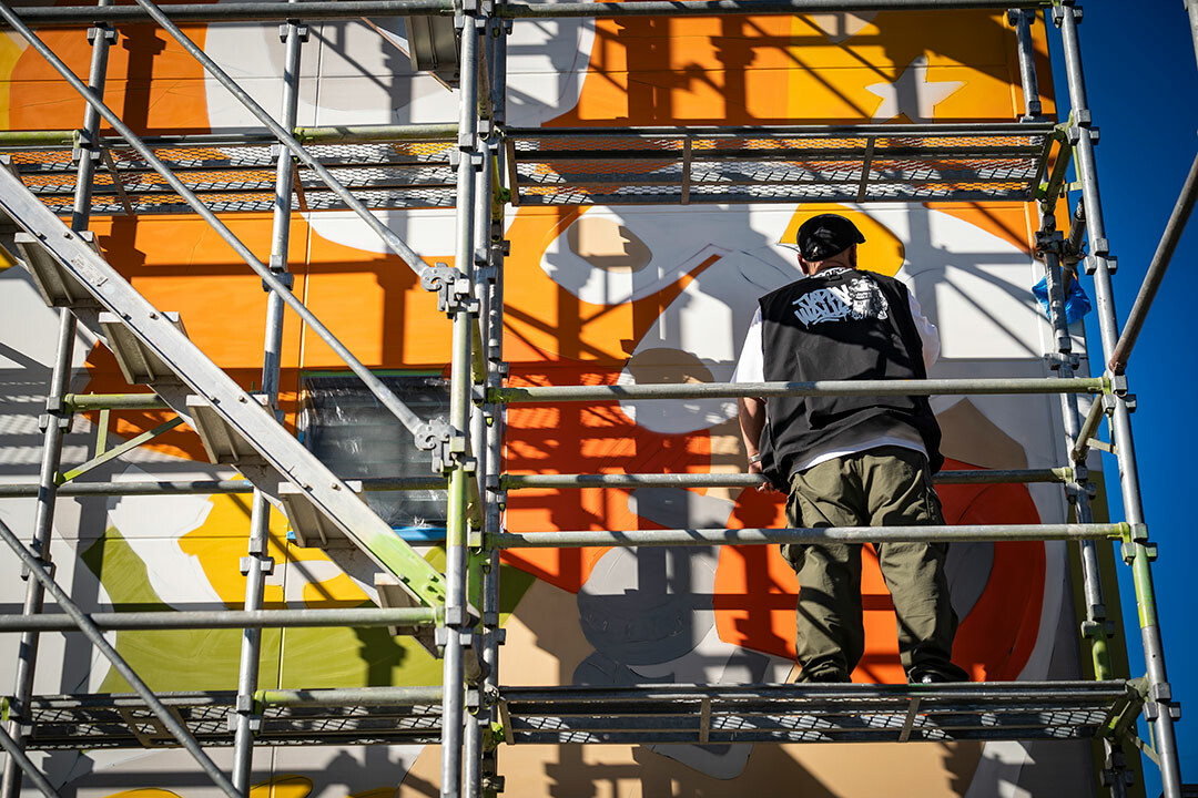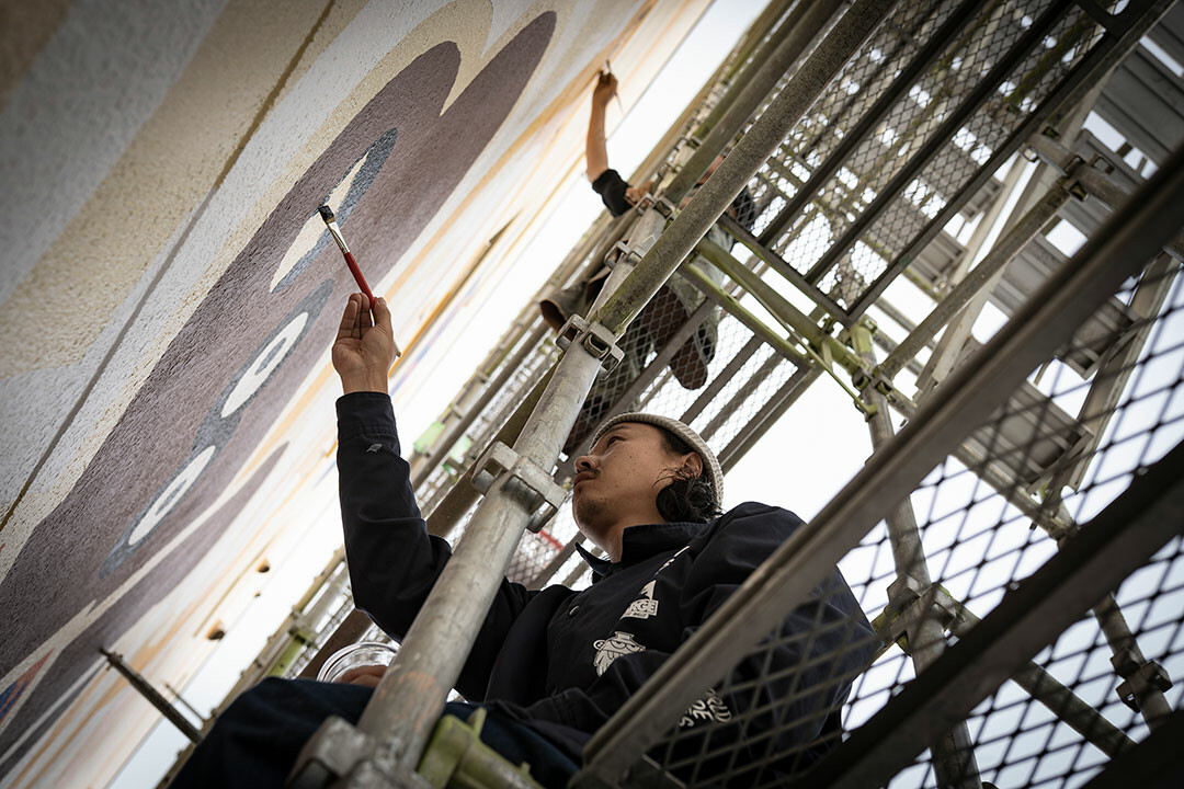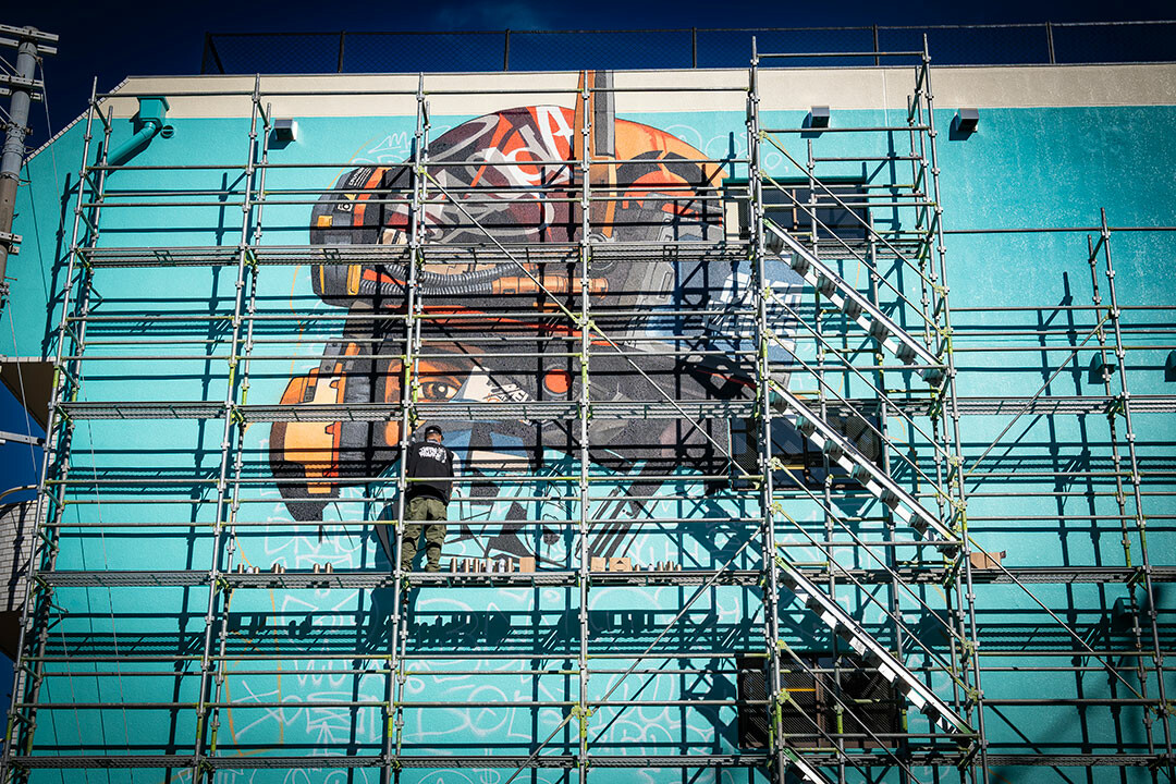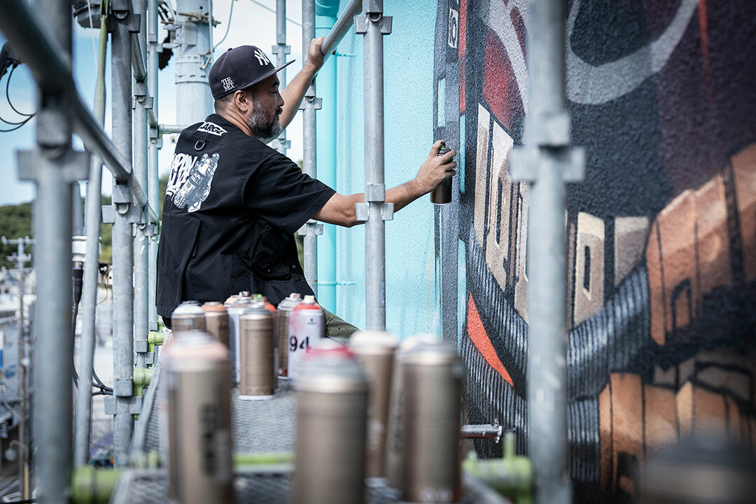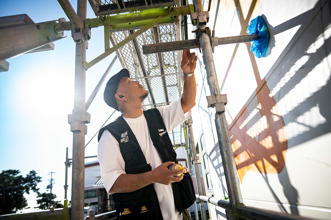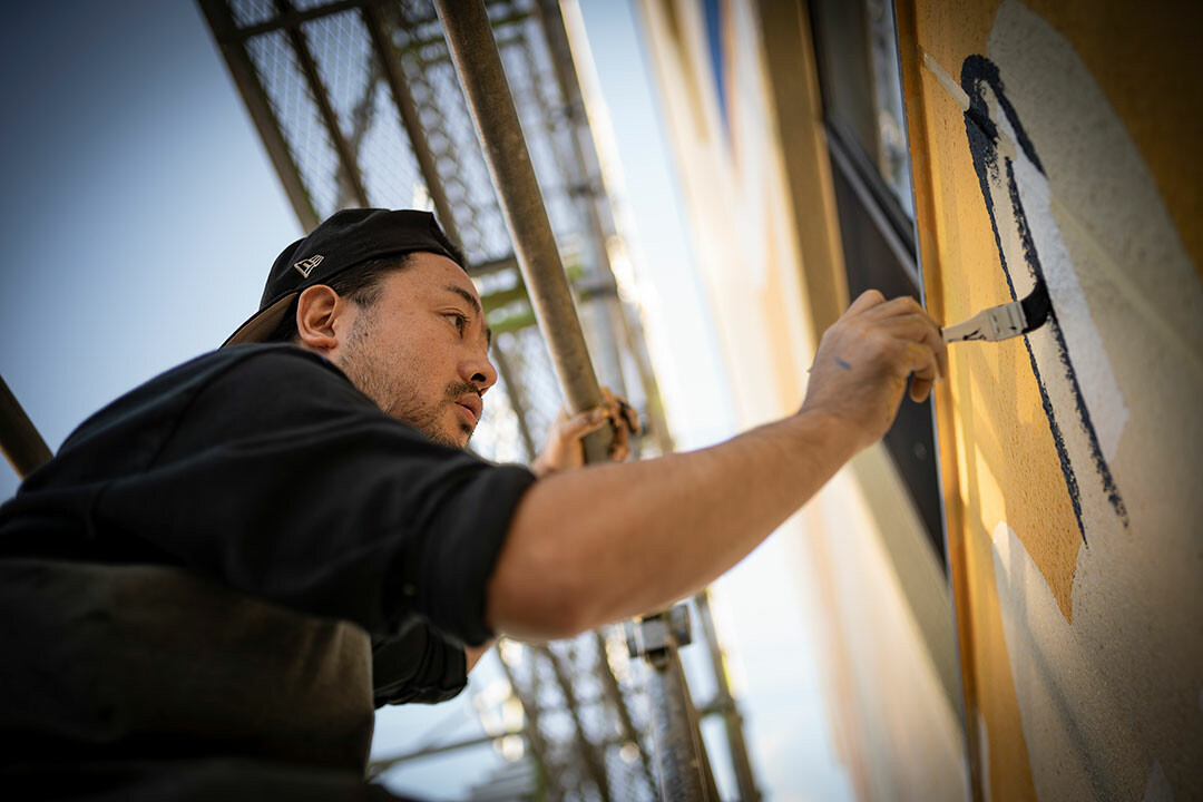 制作をしていると近くに住んでいる人たちが、足場に登って描いている2人を何が出来上がるんだろうと見上げていきます。こうやって「ふだん美術館やギャラリーに足を運ばない人に自分たちの作品を見てもらえるのも壁画制作のやりがいのひとつですね」と松本さん。
