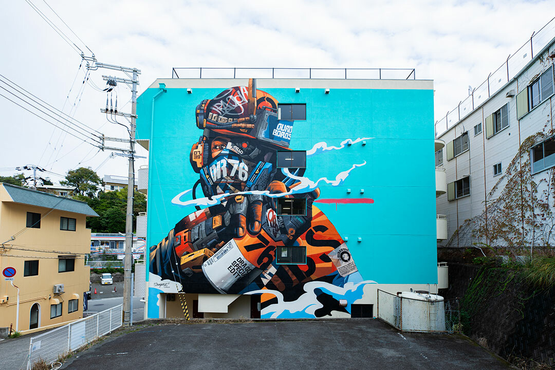 「20号」の作品のすぐ近くで、ダイナミックな壁画が描かれていました。作家はDragon76さん、大阪美術専門学校の卒業生で、2016年からNYに拠点を移してグローバルに活躍しているアーティストです。