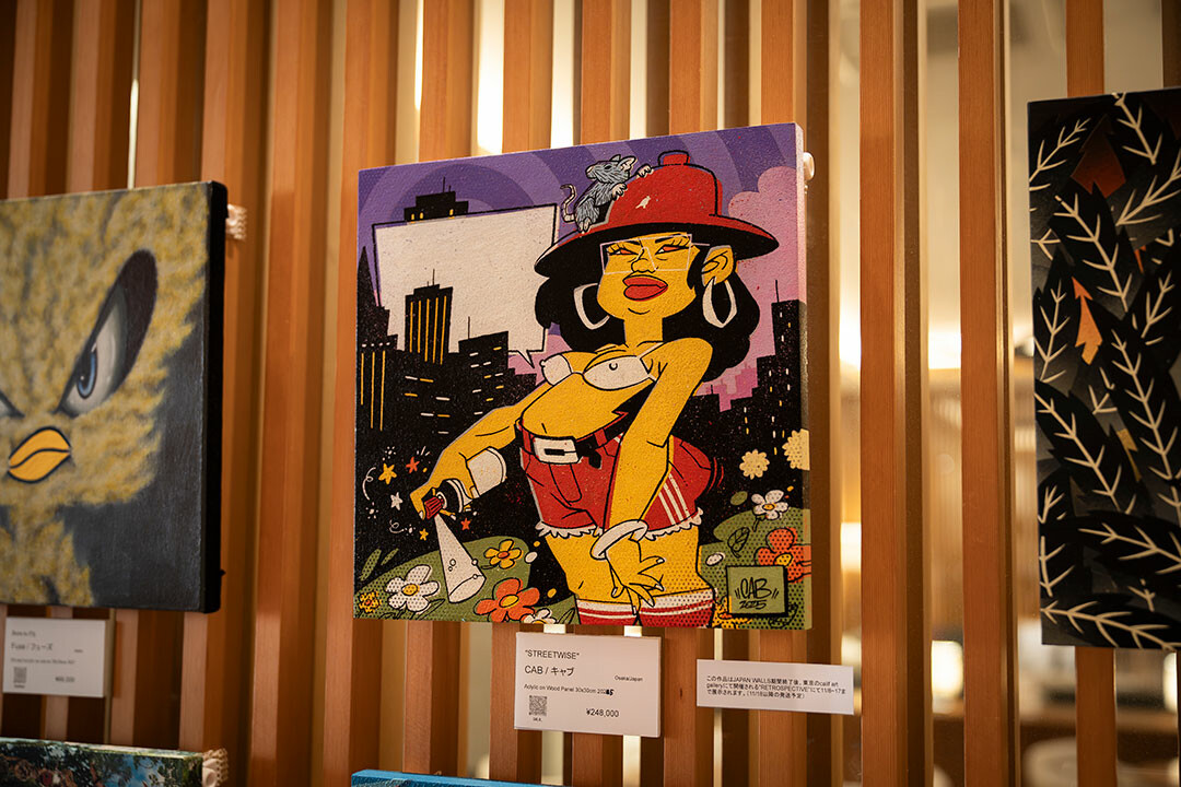 そこから徒歩数分の場所で制作していたCABさんも大阪美術専門学校の卒業生です。CABさんが描くのはコミカルで独特な表情を浮かべた独特なキャラクター。「今回の現場は海にそった大通りなので、青空に映える色使いにしました」とのこと。