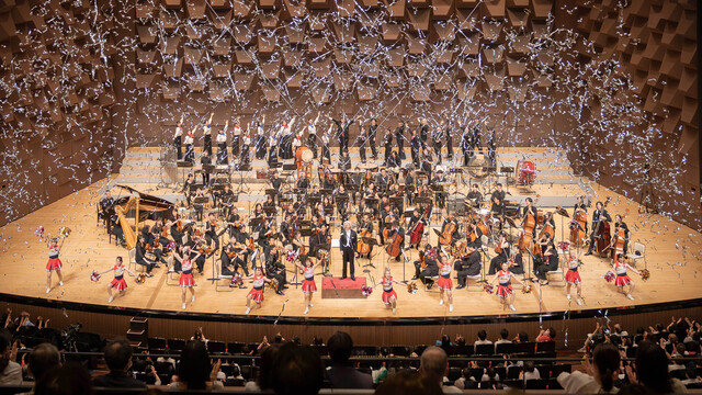 会場となった兵庫県立芸術文化センター KOBELCO大ホールは、世界レベルのオーケストラやオペラの公演も行われる名ホール。大阪芸術大学管弦楽団がスタンバイするオーケストラ・ピットに、国際的マエストロで演奏学科教授の大友直人先生が登場し、雄大な序曲を奏で始めます。幻想的なプロジェクションマッピングが物語の世界へと誘う中、浜畑賢吉先生の生ナレーションで幕が上がりました。