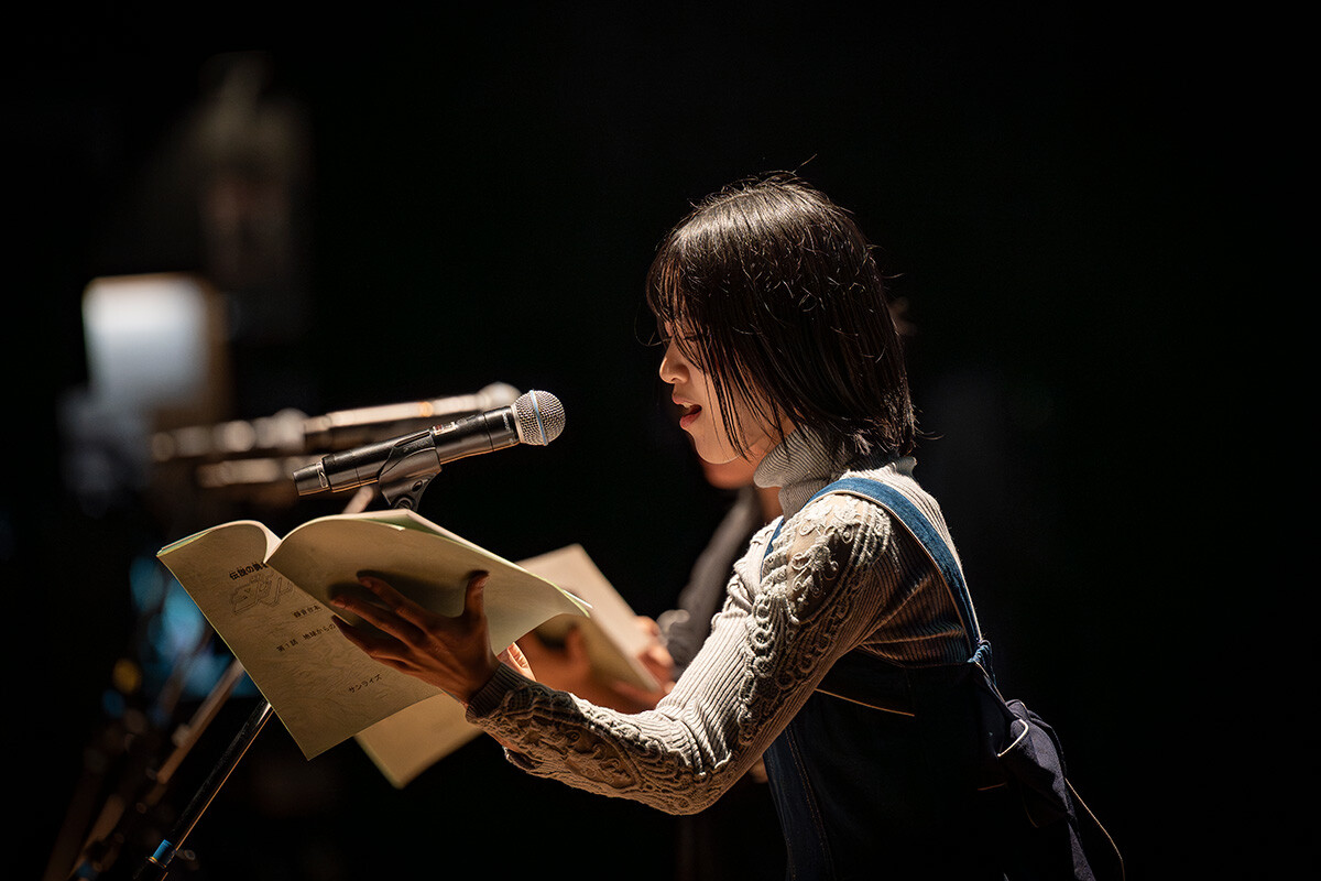 続く「君の青空」は、劇団S.W.A.T!の座長・四大海が舞台用の演目として執筆した作品で、中友子先生によって朗読劇にアレンジされました。物語の時代設定は1944年。第二次世界大戦で日本軍が劣勢の中、山形県・駒ヶ岳に暮らす人々の動向が描かれます。東京から赴任し、抑圧的な態度を見せる陸軍中尉、彼と対立するロケット開発の研究者、赤紙が届いたことに怯える兵器工場の職員、サイパン出征で命を落とした夫の妻……など、それぞれの胸の内が迫真の演技で表現され、戦争の愚かさ、そして平和の尊さを訴えかけました。