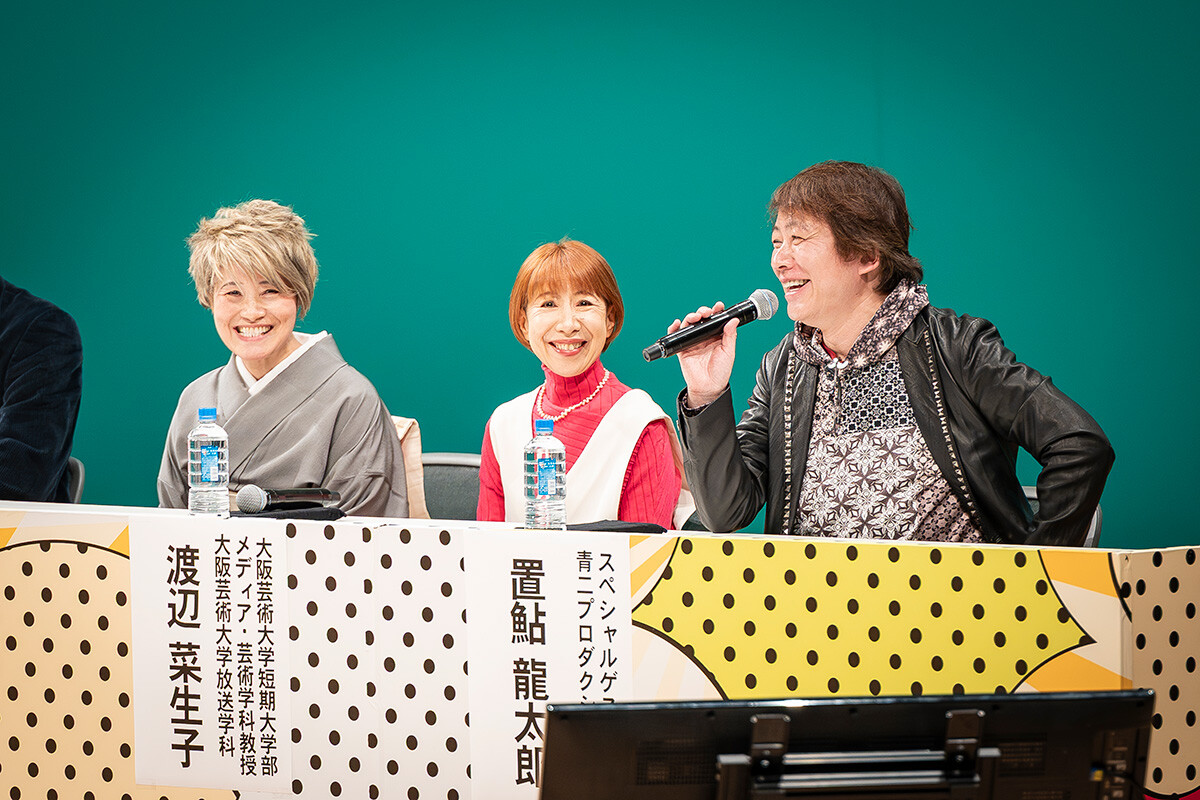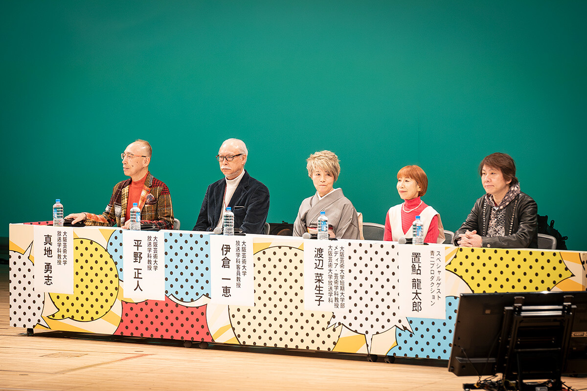 最後は、声優業界を歩む上で「大阪芸術大学での学びがどのように生きるか」という話題になり、総合芸術大学の充実した環境、他学科と幅広く交流が持てる点などがメリットとして挙げられました。また、在学生や声優コースへの進学をめざす高校生に向けては「喜怒哀楽のある生活を送り、感情表現を豊かにすること」(真地先生)、「人前で話すのが苦手でも、演じることでスイッチを入れられるようになる」(平野先生)、「作品制作では、苦しんだ分、その先に楽しいものがある」(伊倉先生)、「声優は声だけでなく体全体で表現する仕事である」(渡辺先生)、「演じることで人生が豊かになり、たくさんの人とコミュニケーションを持つことが作品制作や社会生活に生かされる」(置鮎さん)など、熱いエールが寄せられました。