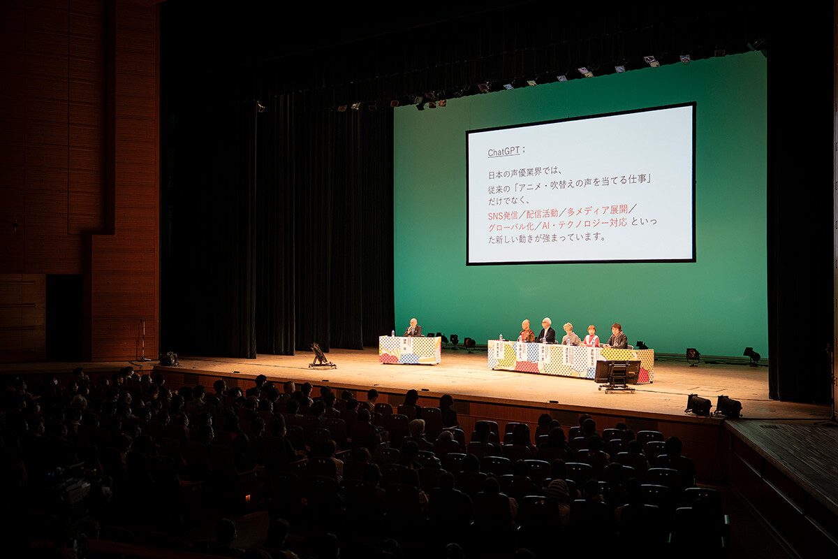 トーク本編では、序盤に日本のコンテンツ市場の現状を紹介。映像系の売り上げが7兆円規模で、特にアニメ関連が右肩上がりであること、海外では鉄鋼産業を越えるほどの勢いであるという報告に会場からは驚きの声が上がっていました。このような状況の中、声優たちの活動はどう展開されるべきかをテーマとした議論が交わされ、歌や映画、ドラマなど、アテレコ・アフレコにとどまらない活動領域の広がりについて熱いトークが繰り広げられました。