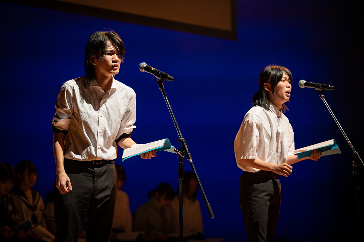 今回の「声優フェスティバル」では、朗読劇「君の青空」で、陸軍第十三科学研究所の職員・瀧下涼介を演じさせていただきました。瀧下はロケット開発に情熱を注ぎ、東京からやってきた陸軍中尉と対立を経て打ち解けるなど、戦時下の社会でめまぐるしい変化に巻き込まれ、戦争の恐ろしさや非情さを経験します。演じるにあたっては、自分の夢や好きなことを意識することで瀧下の思いを伝えられるように心掛けました。技術面でもさまざまなハードルがあったのですが、他の人のセリフをよく聞くようにし、会話のテンポ感がおかしくならないように気を付けました。