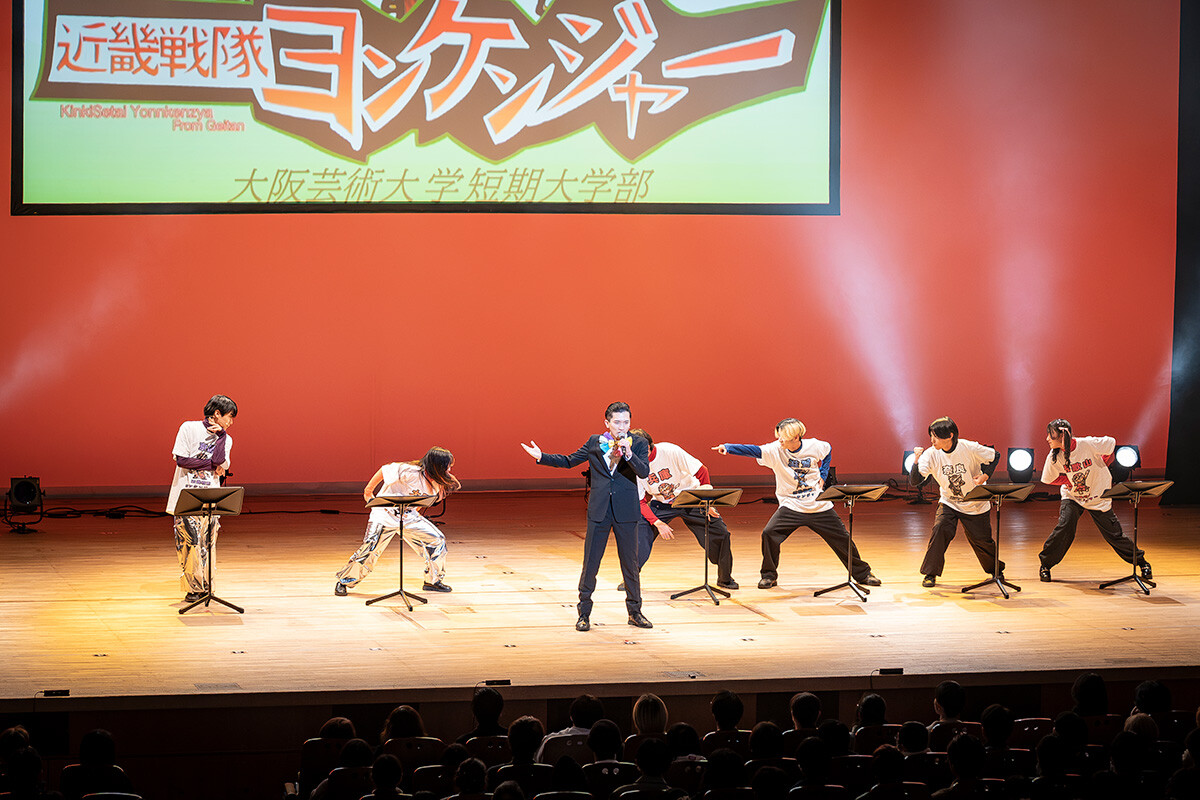 短期大学部による「近畿戦隊ヨンケンジャー」は、声優コースの講師である永田早紀先生が原作・脚本、渡辺菜生子先生が指導を担当。大阪・京都の2府に対抗心を燃やす兵庫・奈良・和歌山・滋賀の4県がチームを編成し、名所や名物自慢で勝負を挑む様子がコミカルに描かれました。「和歌山のパンダ、中国に帰る」「大阪都構想が否決」など、時事ネタも盛り込んだハイテンションギャグの連発に会場からは笑い声も。最後はさらなる強敵・東京に立ち向かうため、2府4県が手を組むというエンディングで幕を閉じました。