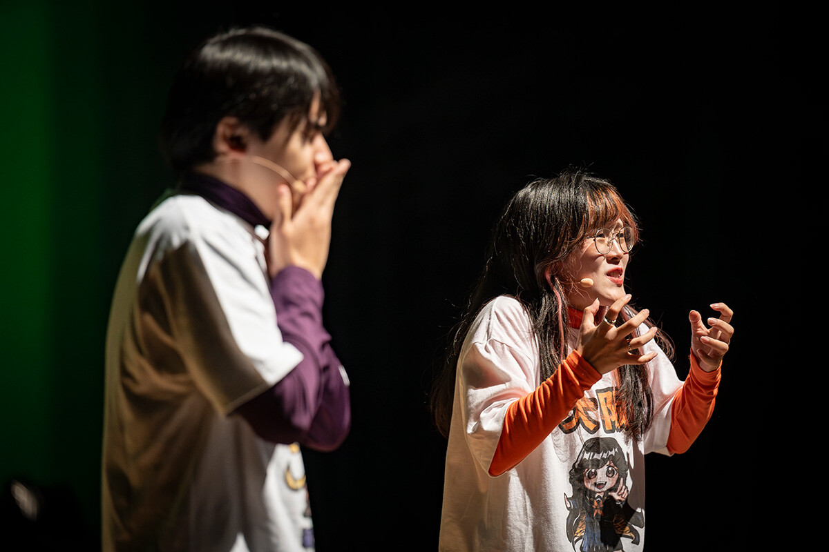 在学中に開催される発表イベントでは最大規模となる本公演。第1部では学生たちによるパフォーマンスが繰り広げられ、舞台上では日頃の学びの成果がいかんなく発揮されました。第2部では教員とゲストによるトークセッションが催され、プロフェッショナルな視点から声優業界の現状が語られました。
