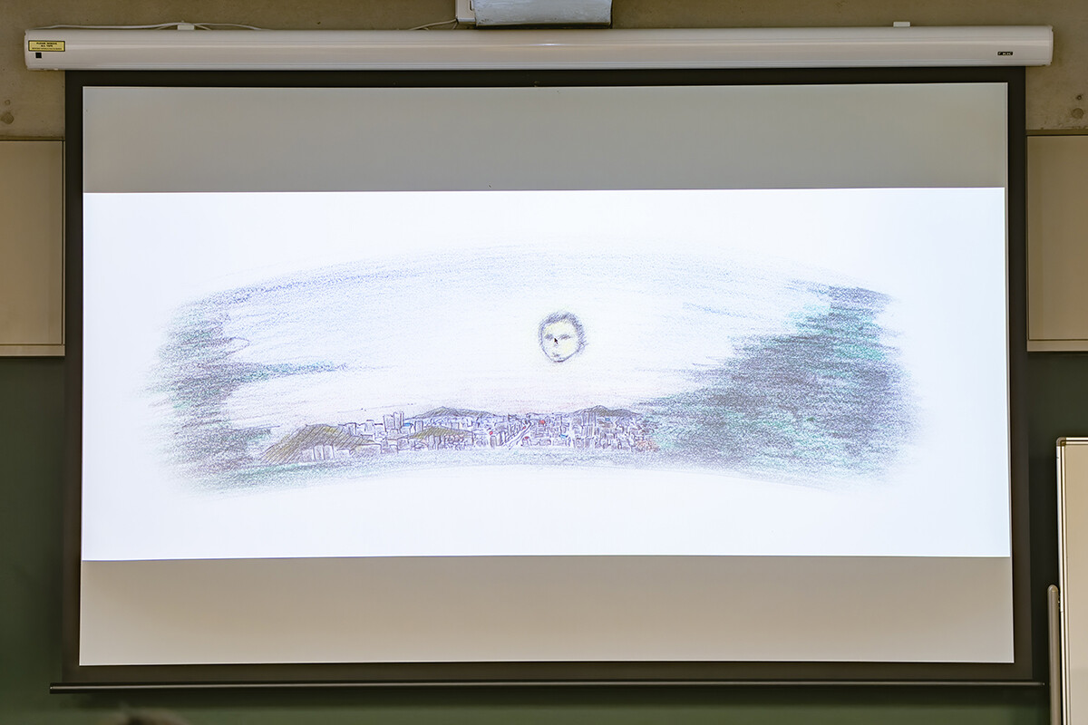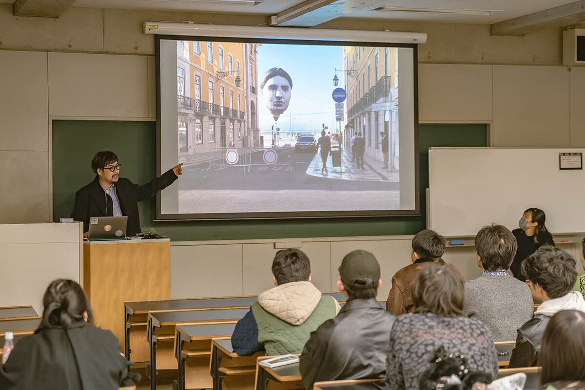 そして講義の終盤では、2021年、コロナ禍の東京で実施された「まさゆめ」について、学生に率直な意見が求められました。不要不急の外出が制限される中、空に巨大な「顔」を浮かべる行為は、どのように受け止められるのか。学生からは、「閉塞感の中で笑いや話題を生んだ」「現実を揺さぶる力があった」といった声が寄せられました。