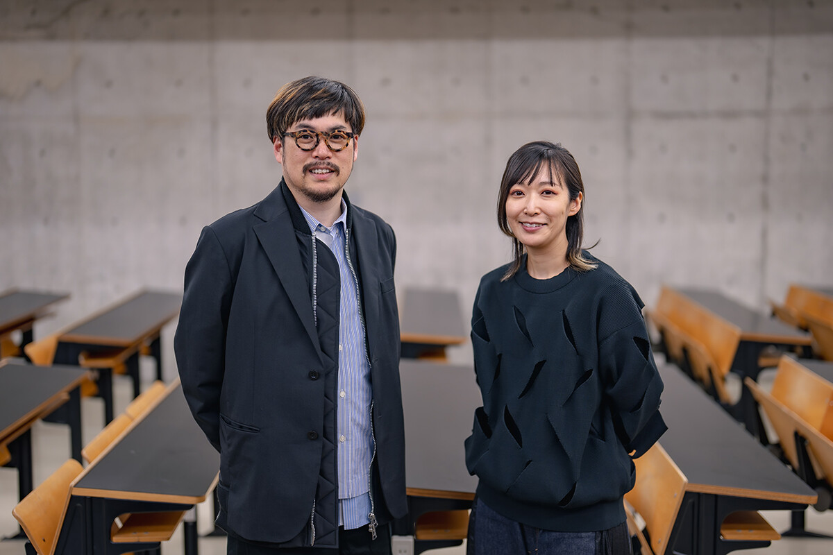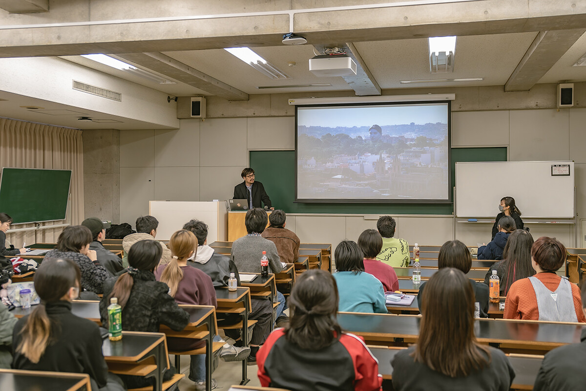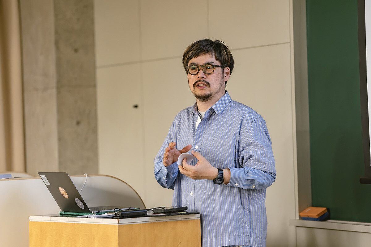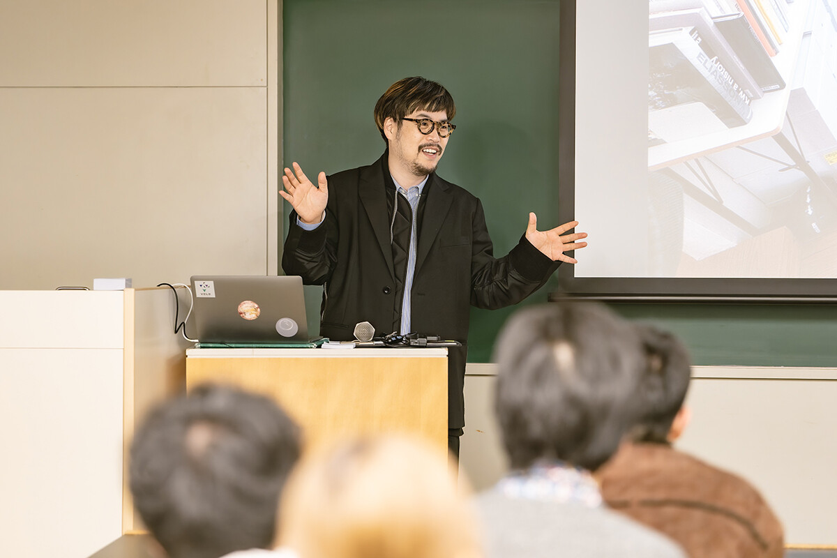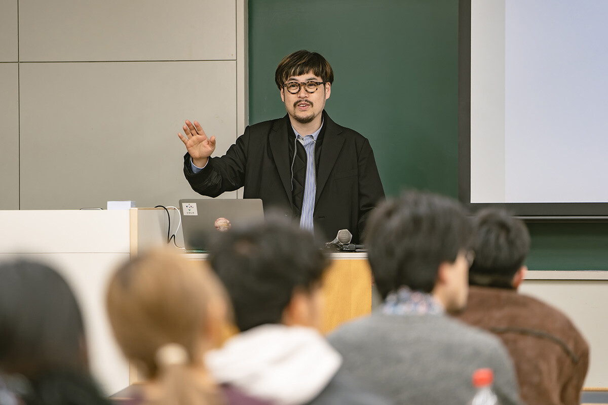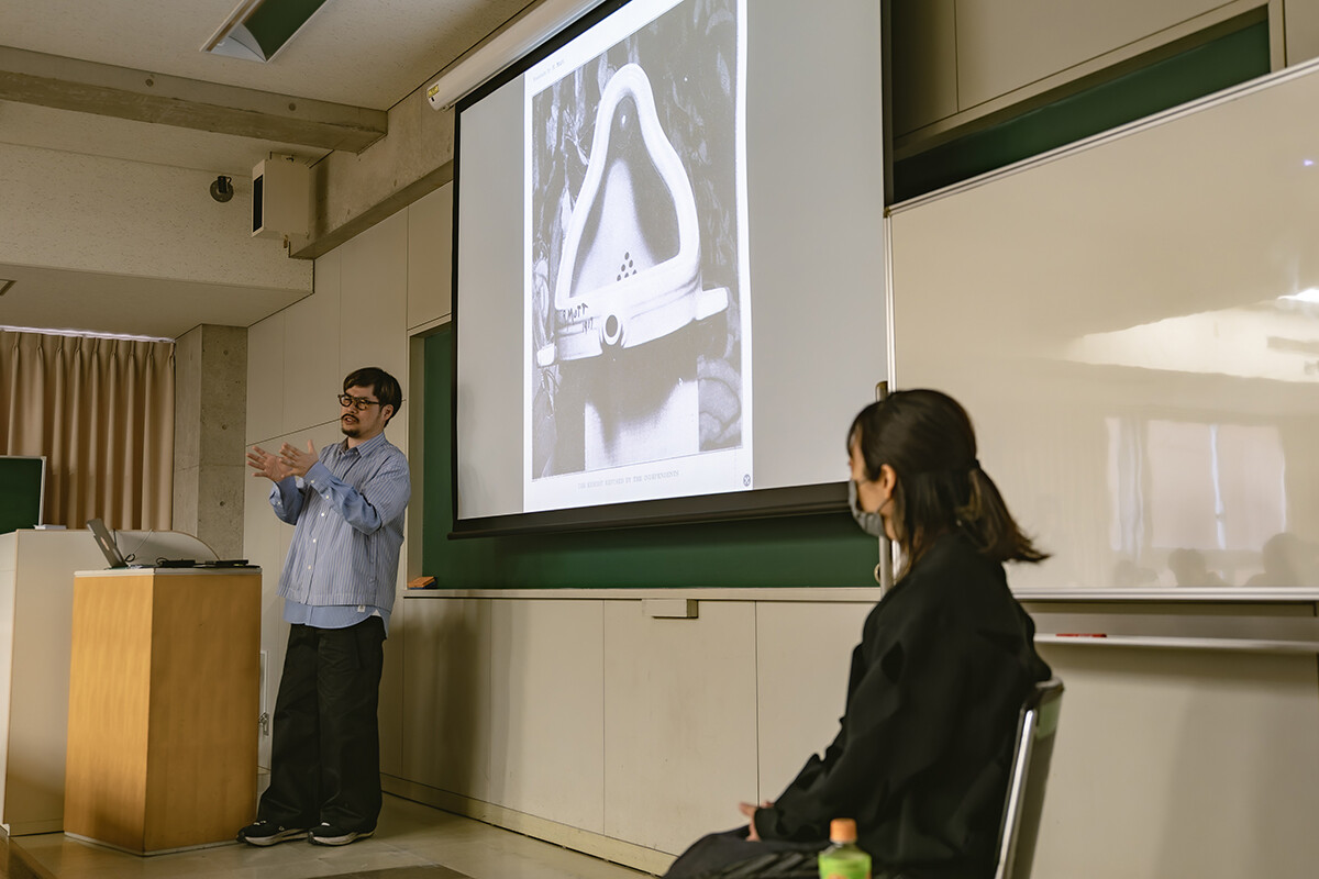 1月20日、美術学科3年生の学生を対象に、国内外で活躍する、現代アートチーム・目[mé](美術学科客員教授)の南川憲二先生と荒神明香先生による特別講義が行われました。講義では、目[mé]の代表作や近年のプロジェクトを紹介しながら、現代アートの考え方や制作の背景について語られ、随所で学生に「問い」が投げかけられました。学生たちはその問いに対し、配布されたメモ用紙に自身の考えや率直な感想を書き込むことで応答。作品解説にとどまらず、「考えること」そのものに重きを置いた、対話的な講義となりました。