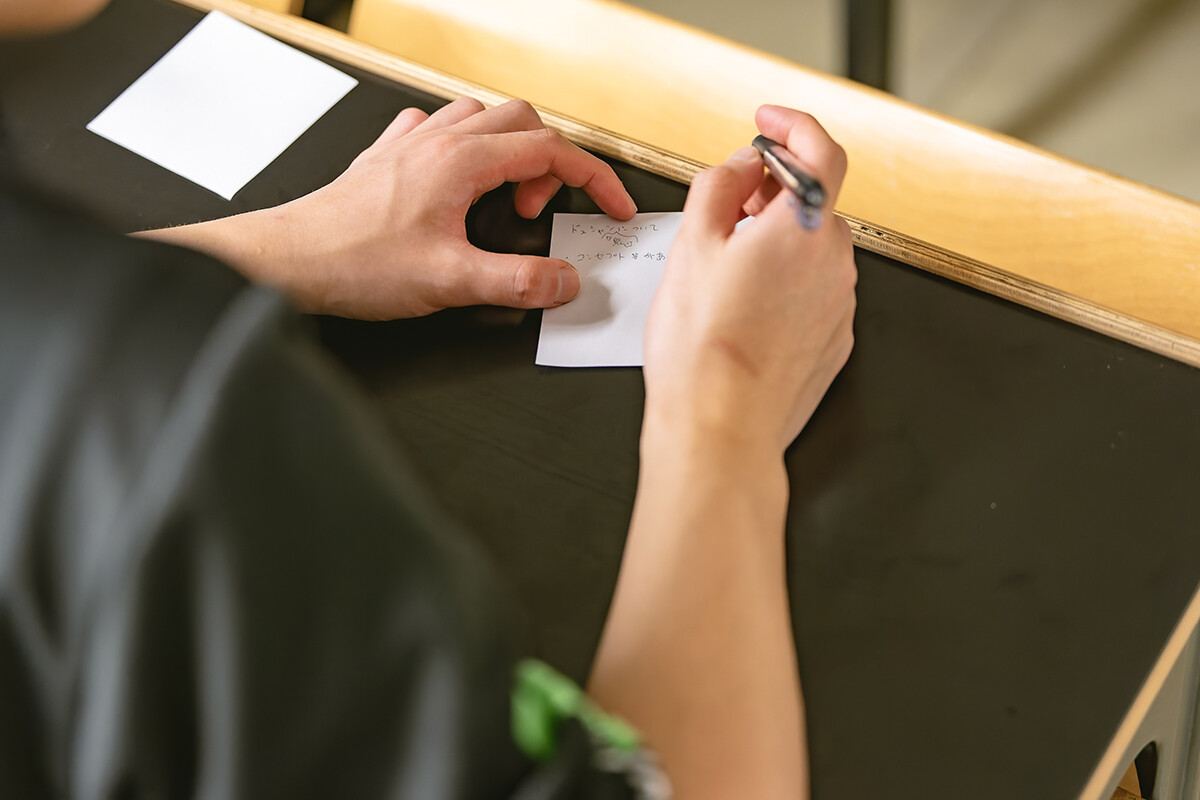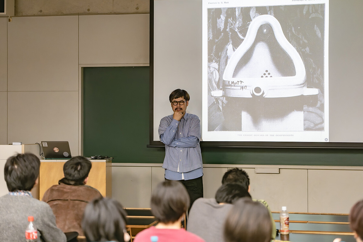 講義の中盤では、南川先生が現代アートの起点とも言われる、マルセル・デュシャンの「泉」を取り上げ、「なぜ便器が芸術作品になるのか」「私たちは何をもって“作品”と認識しているのか」、そうした問いが学生に投げかけられ、メモ用紙にそれぞれの考えを書き込む時間が設けられました。正解を示すのではなく、考えること自体を促す姿勢に、教室には静かな緊張感が漂いました。