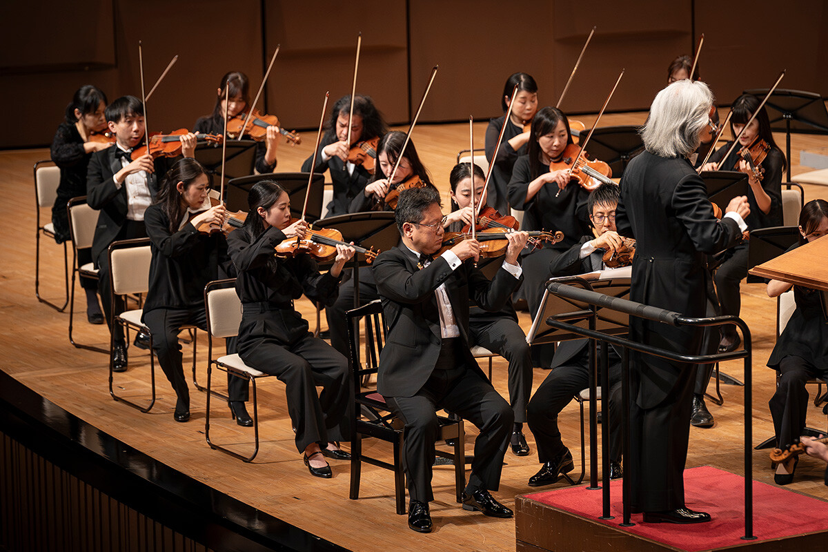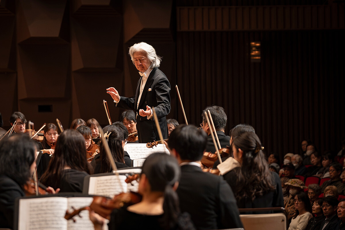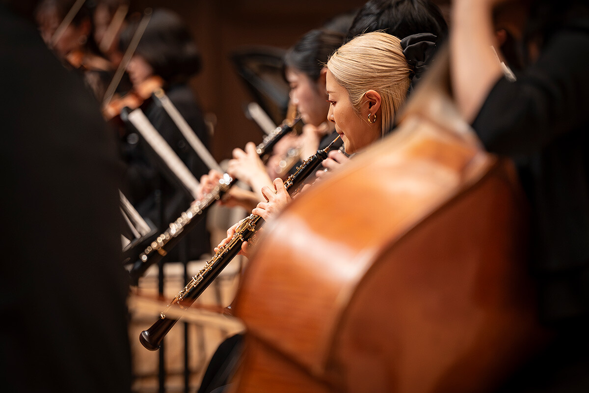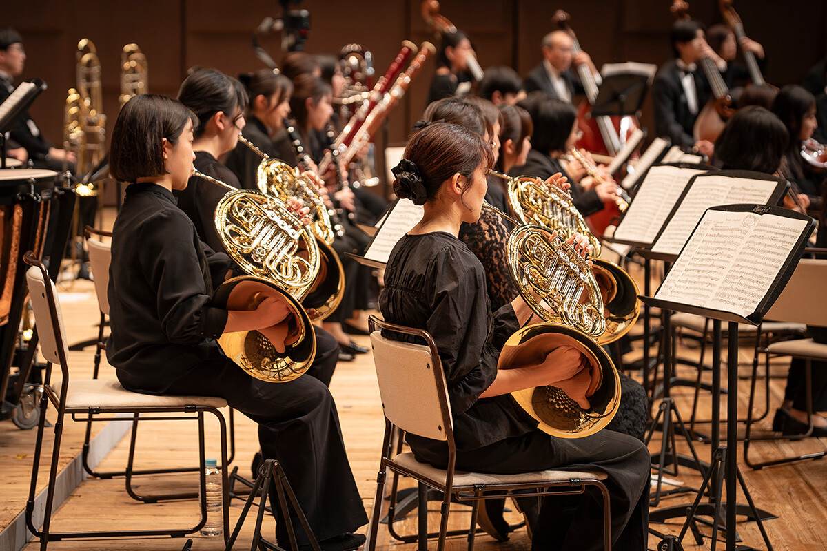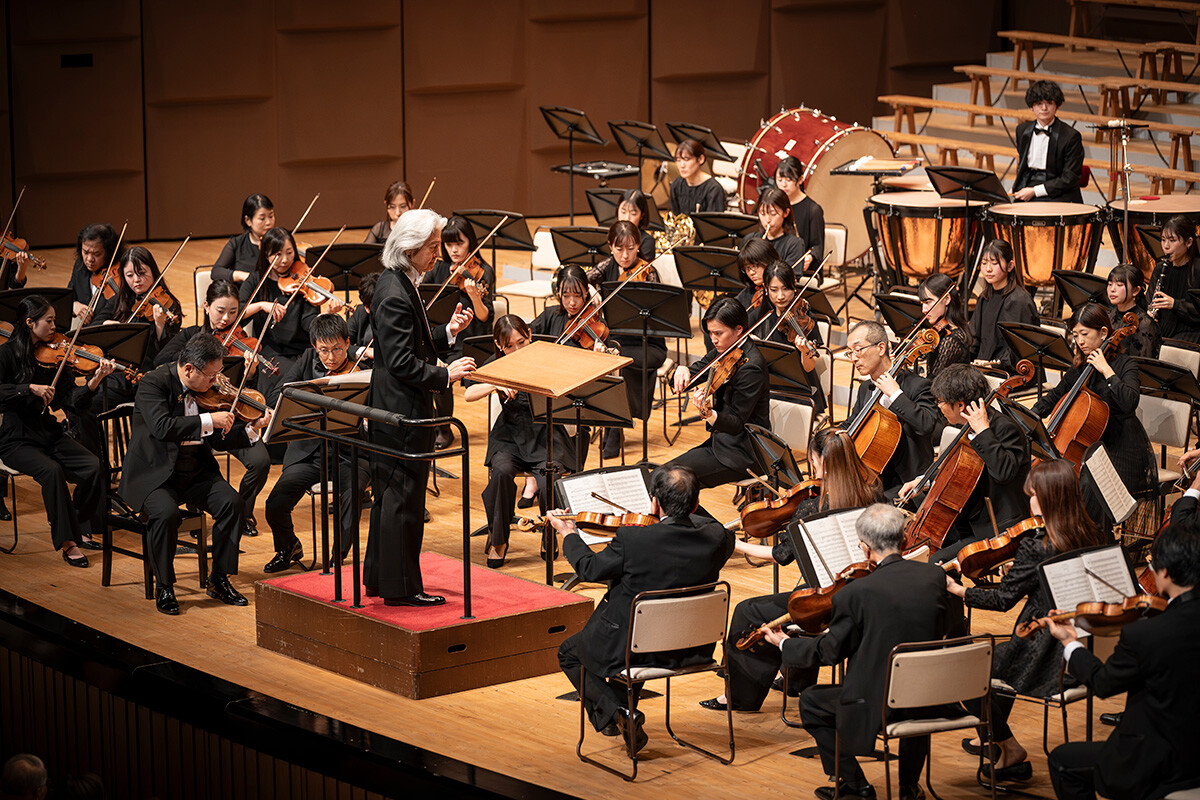 指揮を手がけるのは、国内外の多くのオーケストラと共演し世界的に活躍する演奏学科教授の大友直人先生。学生たちの力を最大限に引き出し、音楽解釈や表現を深めながらも、学生が自ら気づき、考え、表現する姿勢を育む指導を行っています。集中練習や当日の最終リハーサルを経て迎えた本番。会場は期待に満ちた観客でほぼ満席となり、熱気に包まれました。