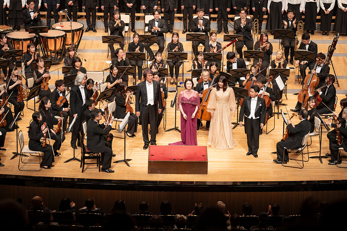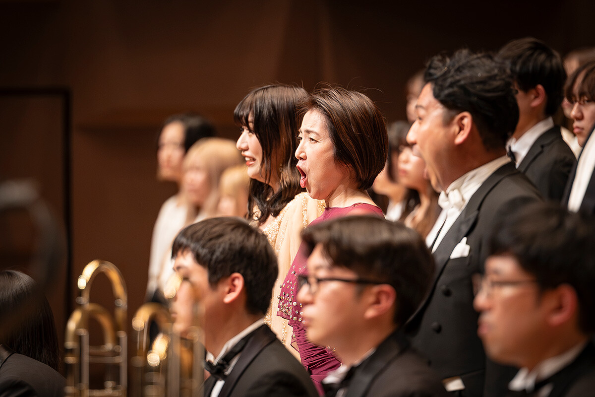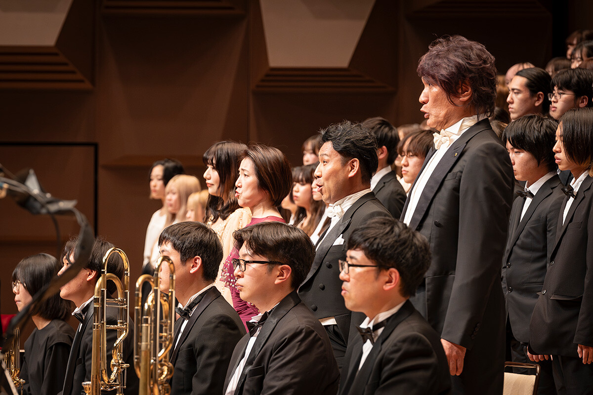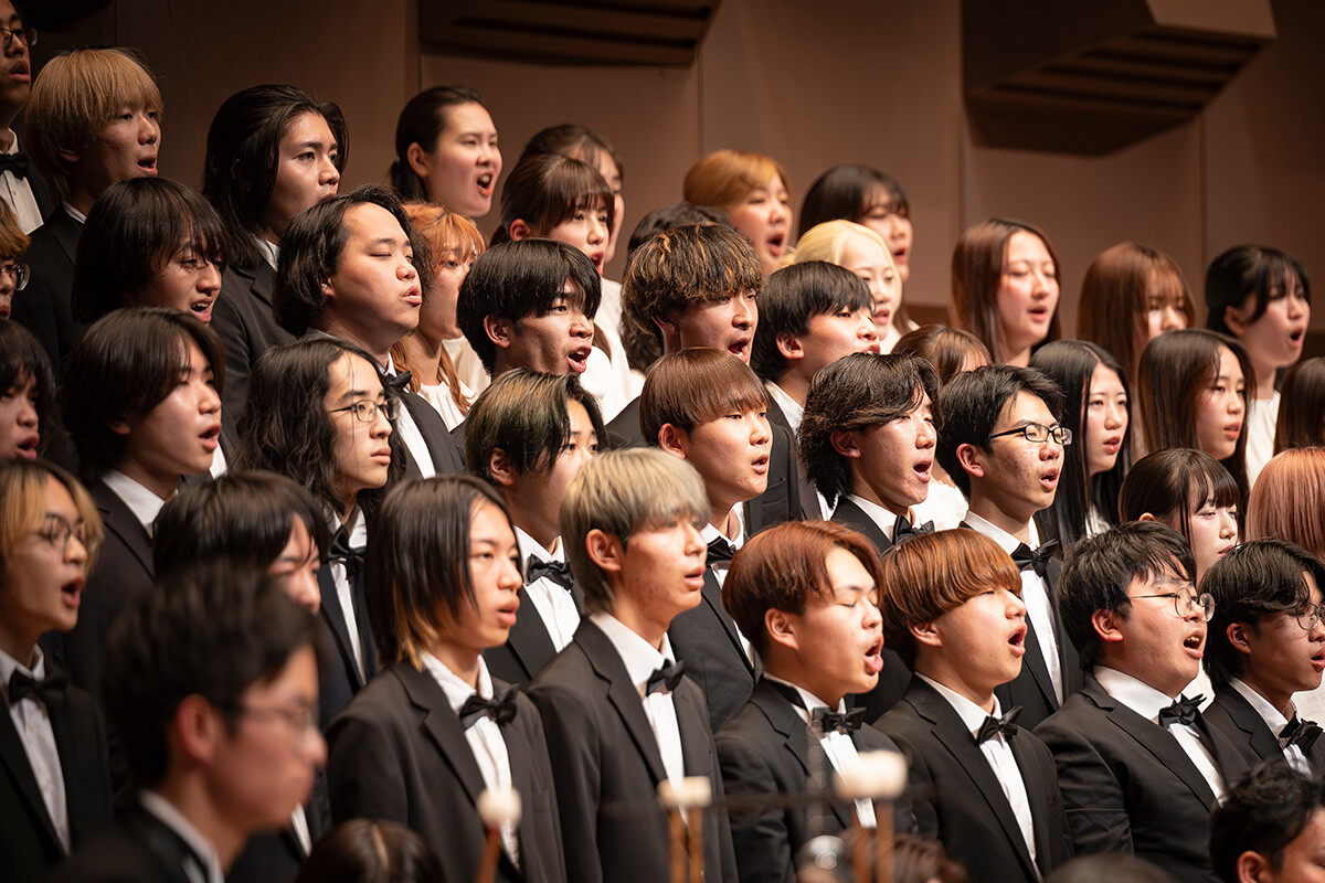 声楽コースだけでなくピアノコースやポピュラー音楽コースの学生たちも加わった大編成の合唱団は、ドイツ語歌詞を暗譜し、一体感と豊かな感情表現を両立。全員の心が一つになった歌声は、フェスティバルホールの大空間を震わせ、合唱もオーケストラも最高潮に達してフィナーレを飾りました。会場からは「ブラボー!」の掛け声と惜しみない拍手が響き、大きな感動の波が広がりました。