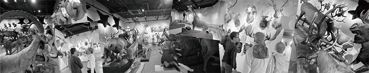 本学の動物ジオラマ館芸大Zooでは、これらの剥製を用いて、それぞれの動物を生息環境として展示するジオラマとして、アフリカの草原、アフリカの森林、岩場のある草原の3シーンをつくり、その他に格闘するワピチ、ヘラジカなどを種ごとに展示するエリアを設けました。ジオラマ展示では、通常は剥製の背面に透視画法で生息地のシーンを描くのですが、本学のジオラマでは正確に表現するために、写真で表現することにしました。2024年8月に本学の若生謙二教養課程主任教授が、ケニアのマサイマラ保護区とアバーディア国立公園、ウガンダのブウィンディ原生国立公園を訪れて撮影し、生息地の様子を再現したジオラマを制作しました。