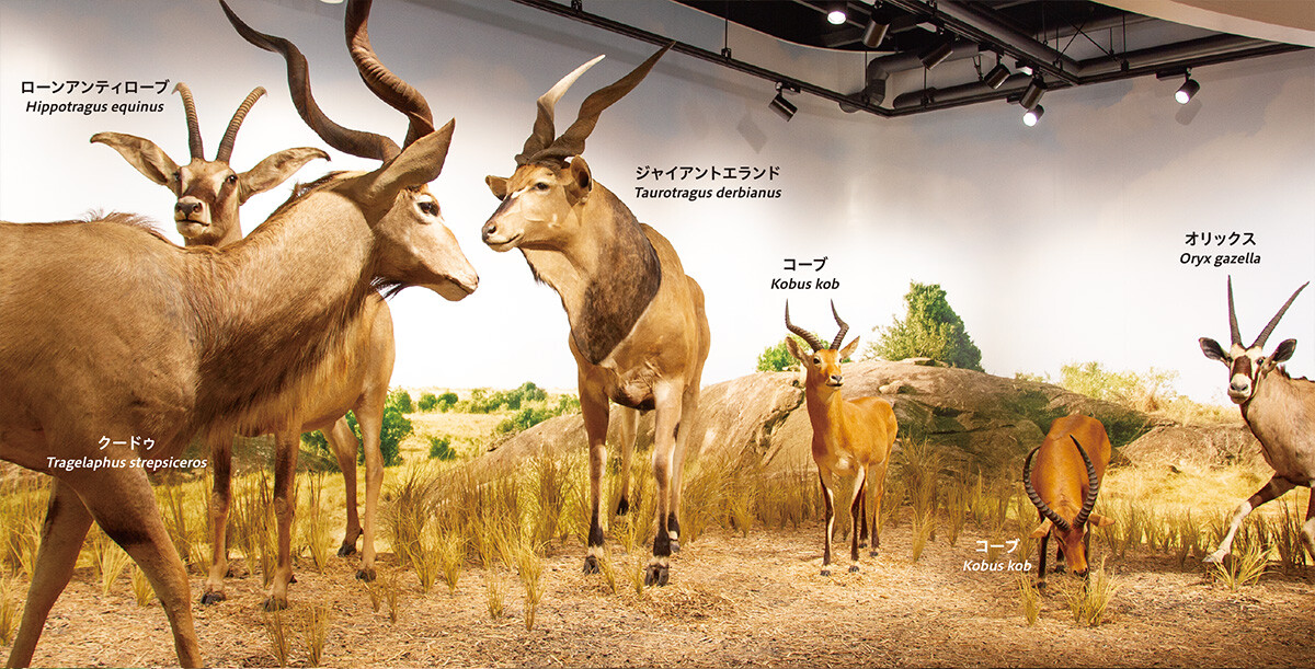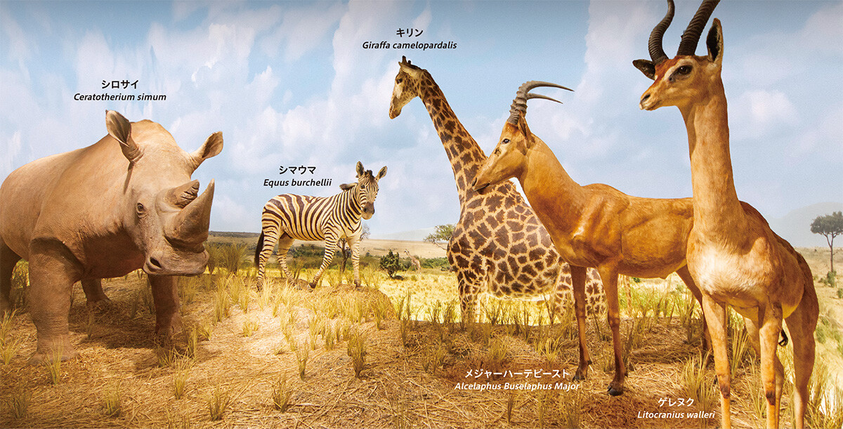 アフリカのサバンナには、コピエとよばれる岩場があります。この岩場は動物のすみかにもなります。この展示ではクードゥ、ジャイアントエランド、ローンアンティロープ、コープなどの草食動物を記しています。延々と広がる草原にはゆるやかな起伏もあり、はるかな奥行きを感じることができます。