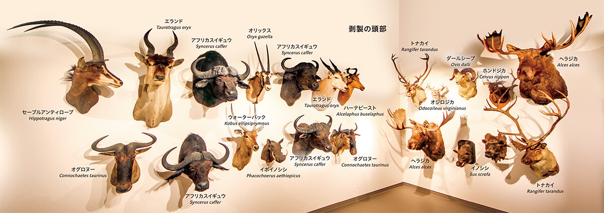 本館に展示されている剥製は、滋賀県信楽町の滋賀サファリ博物館に展示されていたもので、同館の閉館に伴い本学に寄贈されることになりました。同館では初代館長の近藤幸彦氏が世界各地で狩猟した動物の剥製を展示していました。剥製はキリンやシマウマ、エランドなどのアフリカのサバンナの動物とボンゴなどのアフリカの森林、北アメリカや日本の野生動物などからなります。