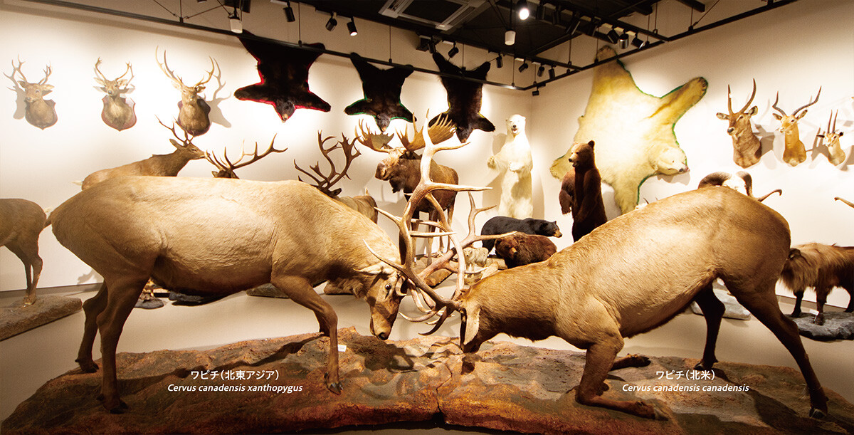 この部屋の動物はジオラマではなく、多くの動物をそれぞれの種ごとに展示しています。中央にはオスのワピチが角をつきあわせた迫力のある格闘の姿がみられます。奥には大きな角のアルタイアルガリ、シペリアアイベックスなど山岳のヤギの仲間、角が大きなヘラ状になっているヘラジカ、トナカイなど平原のシカの仲間、ヒグマやアメリカクロクマ、ホッキョクグマなどのクマの仲間がみられます。壁面には剥製の頭部と毛皮を展示しています。