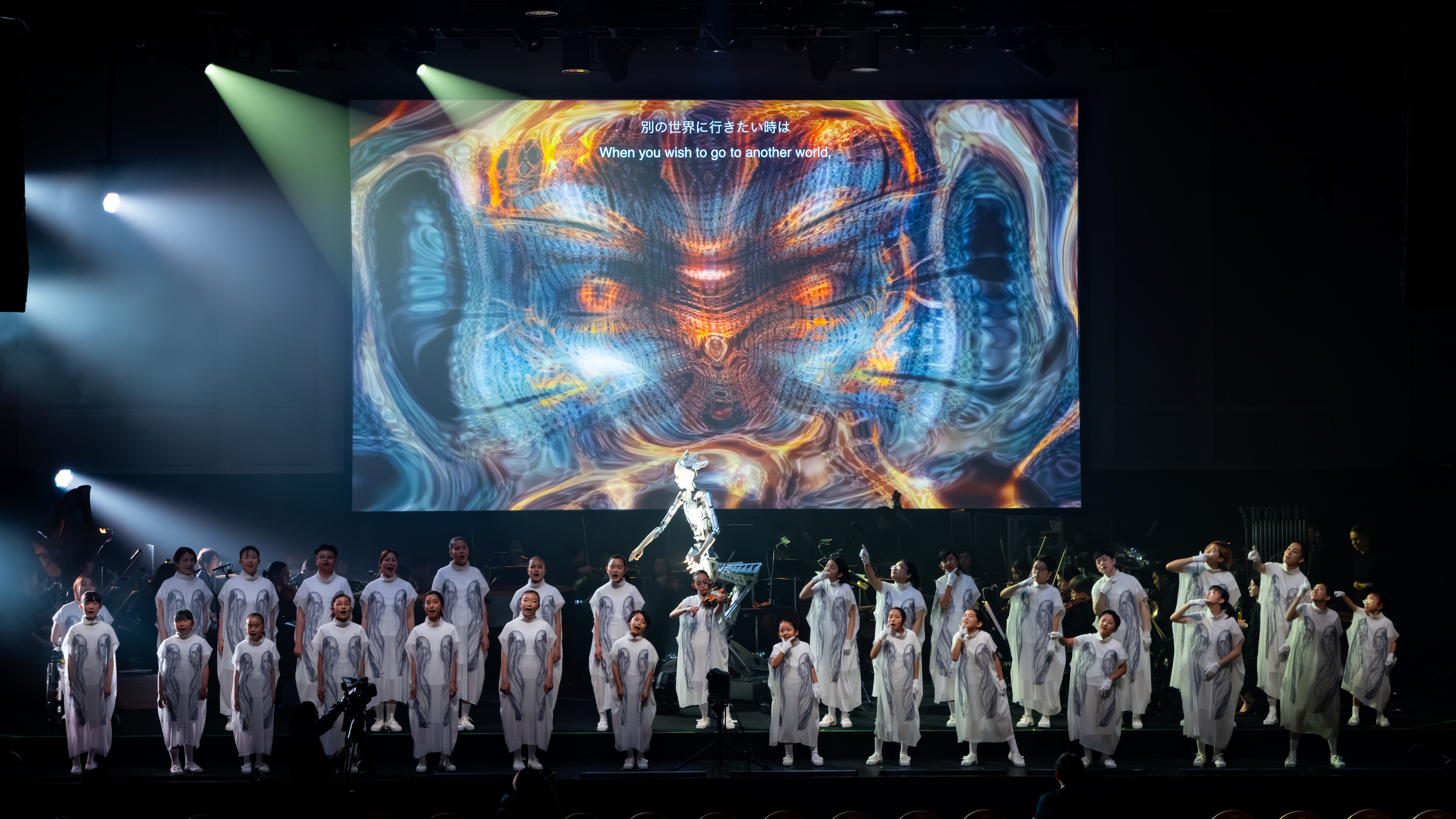 2024年6月18日には『ANDROID OPERA TOKYO』と題し、渋谷先生の作曲・プロデュースによるアンドロイド・オペラ『MIRROR』の東京凱旋公演が恵比寿ザ・ガーデンホールで行われました。同作は2023年にパリ・シャトレ座で上演されたアンドロイドとオーケストラ、1200年の歴史を持つ仏教音楽・声明と渋谷先生自身の演奏によるピアノ、電子音楽、そして映像、照明によって構成される大規模な劇場作品で、日本初演となりました。また、2021年に新国立劇場の委嘱により初演された、子どもたちとアンドロイドが創る新しいオペラ『スーパーエンジェル』の抜粋を前半の第一部として発表。視覚や聴覚に障害を抱えるなど多様な子どもたちから構成される『ホワイトハンドコーラスNIPPON』による児童合唱が参加し、渋谷先生のピアノとアンドロイド、オーケストラの演奏に加え、新進気鋭のアーティスト岸裕真氏によるAIを用いた映像が披露されました。そして第二部『MIRROR』のステージではオルタ4がヴォーカルを務め、高野山から4名の僧侶であり声明の演奏家が参加。映像はフランス人ビジュアルアーティスト・ジュスティーヌエマール氏が映像のライブミックスのために来日しました。