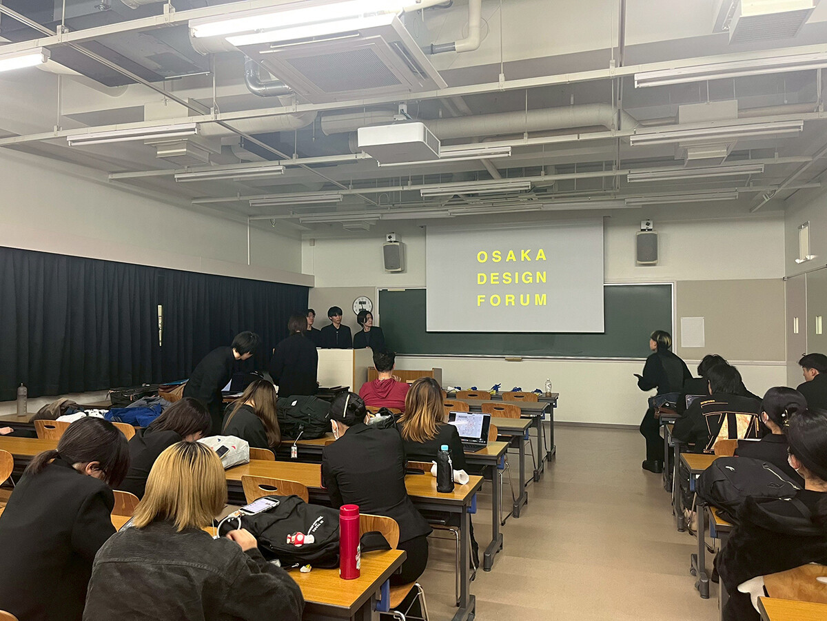 11月7日には、会場となる大阪市中央公会堂で一部の学生が下見や当日に放映する映像の確認を行いました。同じ日、大学ではフォーラム直前の授業が行われ、学生全員が当日の服装チェックのため全身黒の装いで出席し、当日の段取りについて最終的な打ち合わせを実施しました。また、WOOMA氏の講演やトークセッションの際ステージに設置されたテーブルは、プロダクトデザインコース2年生の見賀理人さんが制作したものです。学生たちは、デザインイベントを自分たちの手で作り上げることを学びながら、協力し作業を進めて本番に備えました。