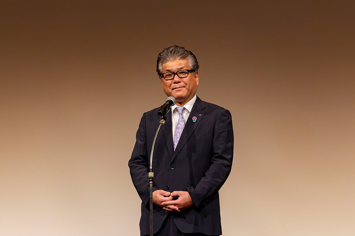 フォーラム当日は、幅広い年代の来場者が多数訪れ、開演時間になると、学生が制作したゲストの山田健人氏、WOOMA氏、田中裕介氏を紹介する映像が上映されました。その後、大阪芸術大学副学長の塚本英邦先生による開会のあいさつで幕を開けました。塚本副学長は、デザイン学科で展開されるハイパープロジェクトの取り組みやこれまでの歩みを語り、「オオサカデザインフォーラムのコンセプトは、“学生とトップクリエイターとの共振”です」と語りました。