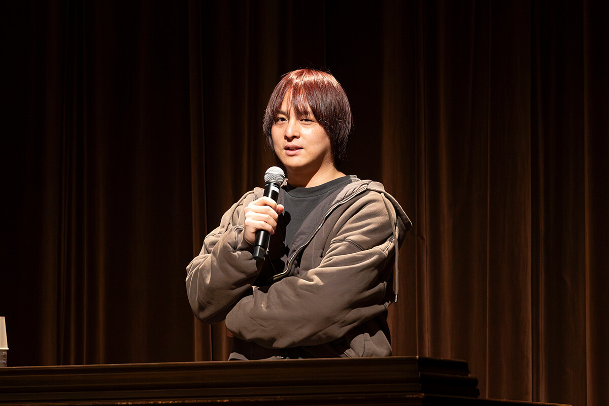 デザイン学科・東陰地先生の進行のもと行われたトークセッションでは、関心の高いテーマについて、登壇した3名がそれぞれの視点で回答しました。「依頼企業」と「ライブやMVを見る視聴者」、どちらを意識して制作するかという質問に対して、田中氏は「視聴者を意識する」と回答。WOOMA氏は「自分が描きたいものを軸に、必要に応じて調整する」と語りました。山田氏は「どちらか一方ではなく、自身のスタイルを保ちながら双方にとっての最適な着地点を探す」とコメントしました。続いて、綿密な絵コンテによる計画性と、その場の発想による即興性、どのように使い分けるかについて、田中氏は「ケースバイケースだが、最終的には計画的に整理していく」と回答。山田氏は「絵コンテはほとんど描かないが、事前準備は必ず行い、ビデオコンテでは自ら演じてシミュレーションする」と話し、ライブ演出でも即興性を重視するスタンスを明かしました。チームでの制作体制やリーダーとして心掛けている点について、田中氏は「自分の想像を超える提案が生まれる瞬間がうれしい。チームとして作品を育てることを大切にしたい」と語り、全員で作り上げる過程の魅力を強調。WOOMA氏は「基本は1人で制作しているので、現場の回し方をぜひ聞きたい」とコメントし、山田さんは「同じスタッフでも馴れ合いにならず、常に新しいアイデアを出し合える関係性を大切にしている」と話しました。