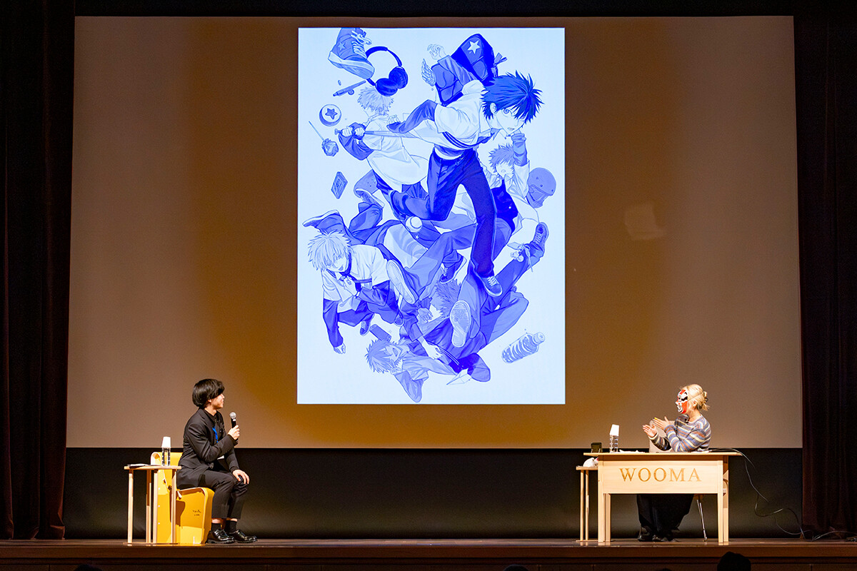 質問に対しても、創作への向き合い方を率直に語りました。WOOMA氏がイラストを仕事にしようと意識したのは美大入学の頃。「影響を受けた作品は?」という問いには、少年誌、特に『週刊少年ジャンプ』が好きで、中でも『BLEACH』のシンプルで鋭いデザインや余白の使い方から大きな影響を受けたと話ました。MV制作では、楽曲を受け取ったあとに絵コンテでキャラクターを固め、音から色や世界観を拾い上げて形にしていくプロセスを紹介。オリジナル制作では自由に、依頼作品ではアーティストのイメージを大切にしつつ「基本的には任せてもらっている」という信頼関係を重視する姿勢も示しました。動画制作では「冒頭30秒を特に大切にする」「最初の勢いで“見たい”と思わせることが重要」と発言。完成までの期間はオリジナルで1〜2週間、MV制作では約2ヶ月程度と語り、一番楽しい瞬間は「キャラクターの顔、特に目を描くとき」と言います。「美大時代からクロッキーが大好きで、ずっと人を描いていたい」と語り、表情へのこだわりを深く感じさせました。「学生時代に戻れるとしたら?」という問いには、「美大を中退して映像の学校に移ったので、卒業したかったかも」と振り返りました。最後に50分で書き上げたイラストにサインを添えて披露し「厚塗りの実践をしたので、参考になればうれしいです」と締めくくりました。