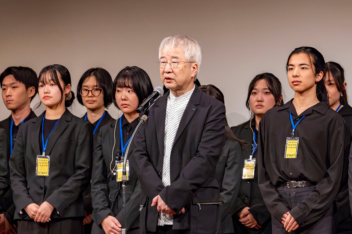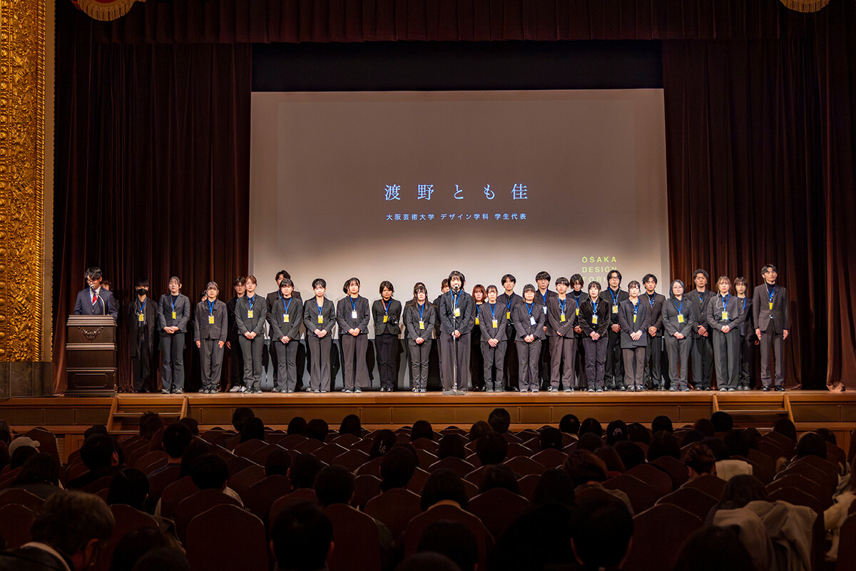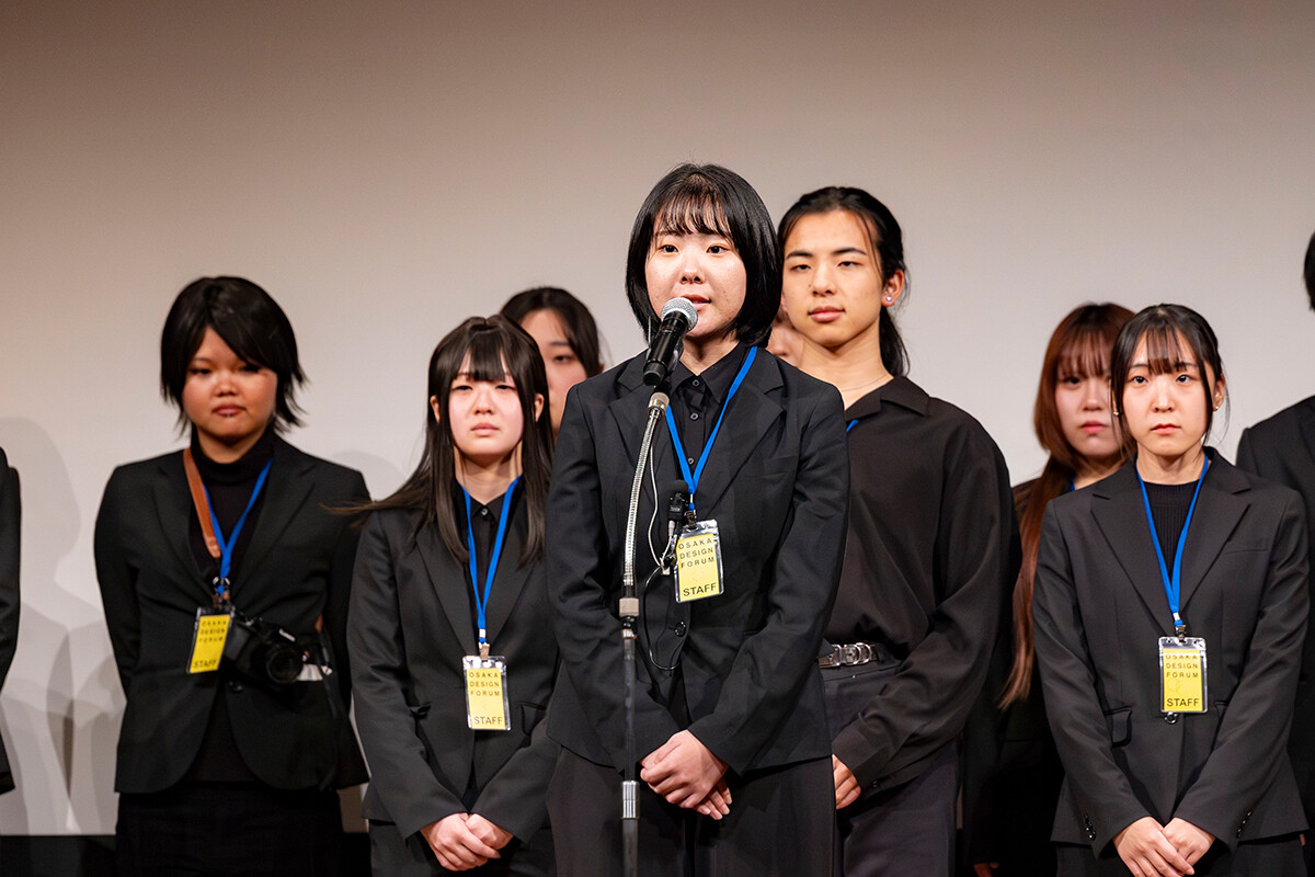 トークセッション後、学生企画実行委員がステージに並び、代表を務めたプロダクトデザインコース3年生の渡野とも佳さんが「オオサカデザインフォーラムは、学生が主体となり企画から広報・運営まで取り組んできました。本日のセッションを通して、デザインに対する新しい価値観やヒントを持ち帰っていただければうれしく思います。ご協力くださった皆様に心より感謝申し上げます」とあいさつの言葉を述べました。