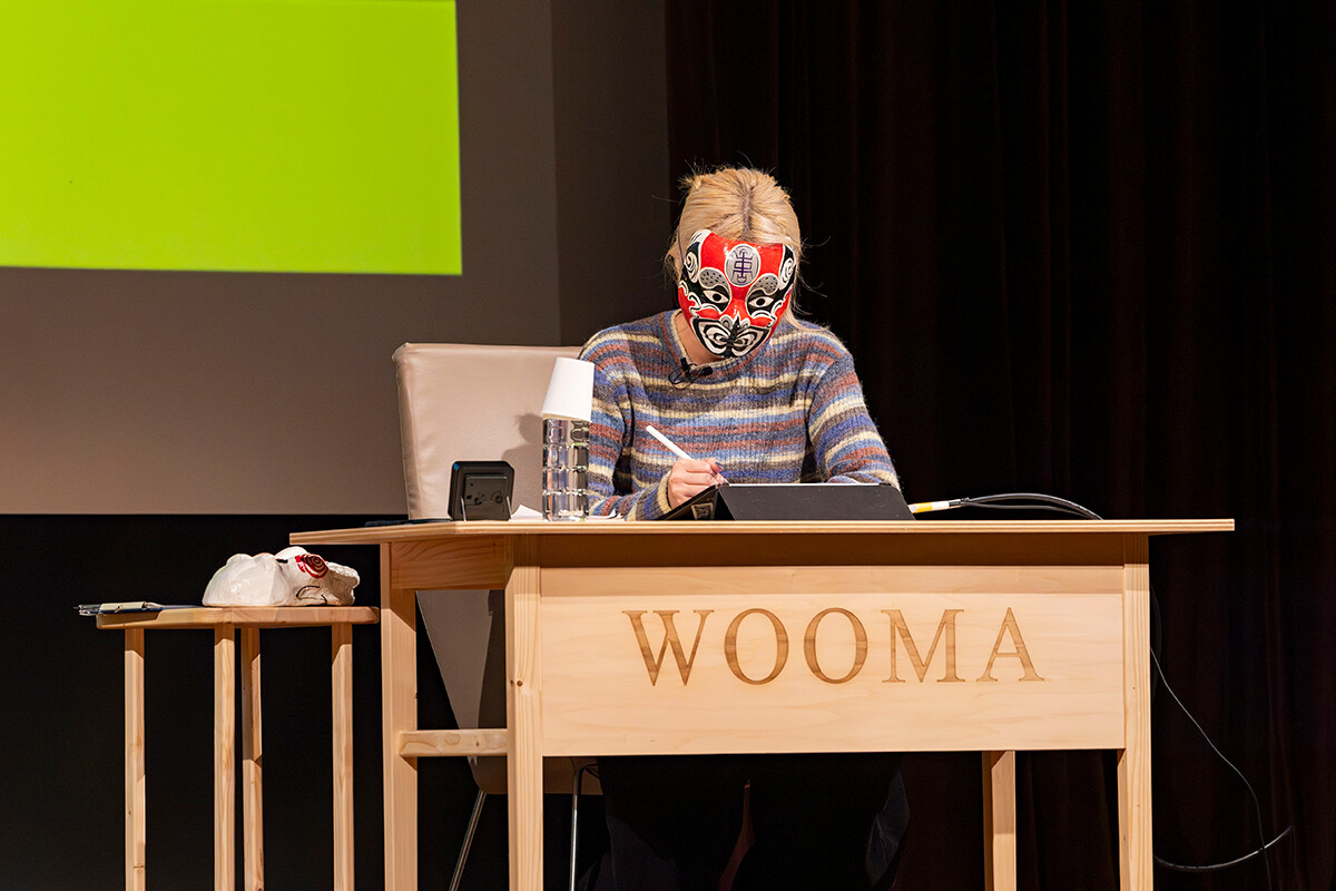 マスク姿でステージに登場し、作品のタッチについて語るWOOMA氏