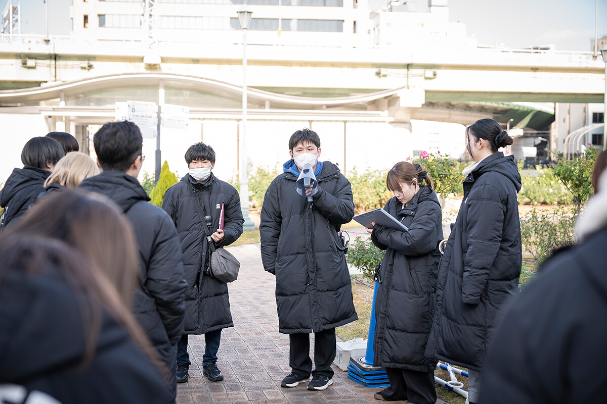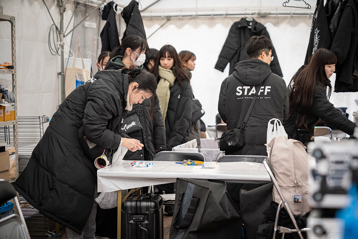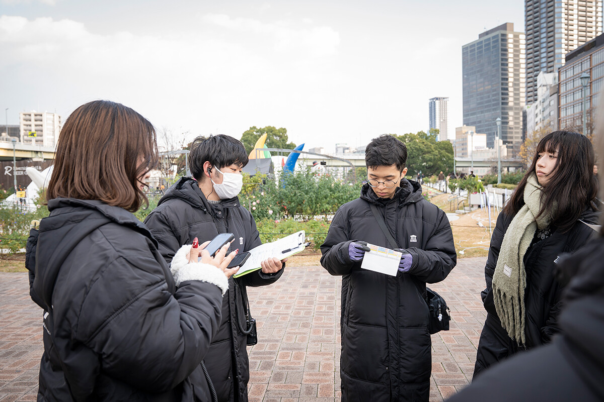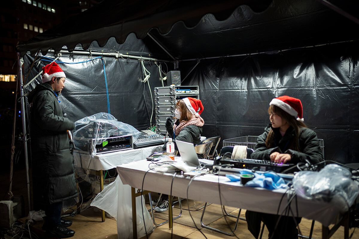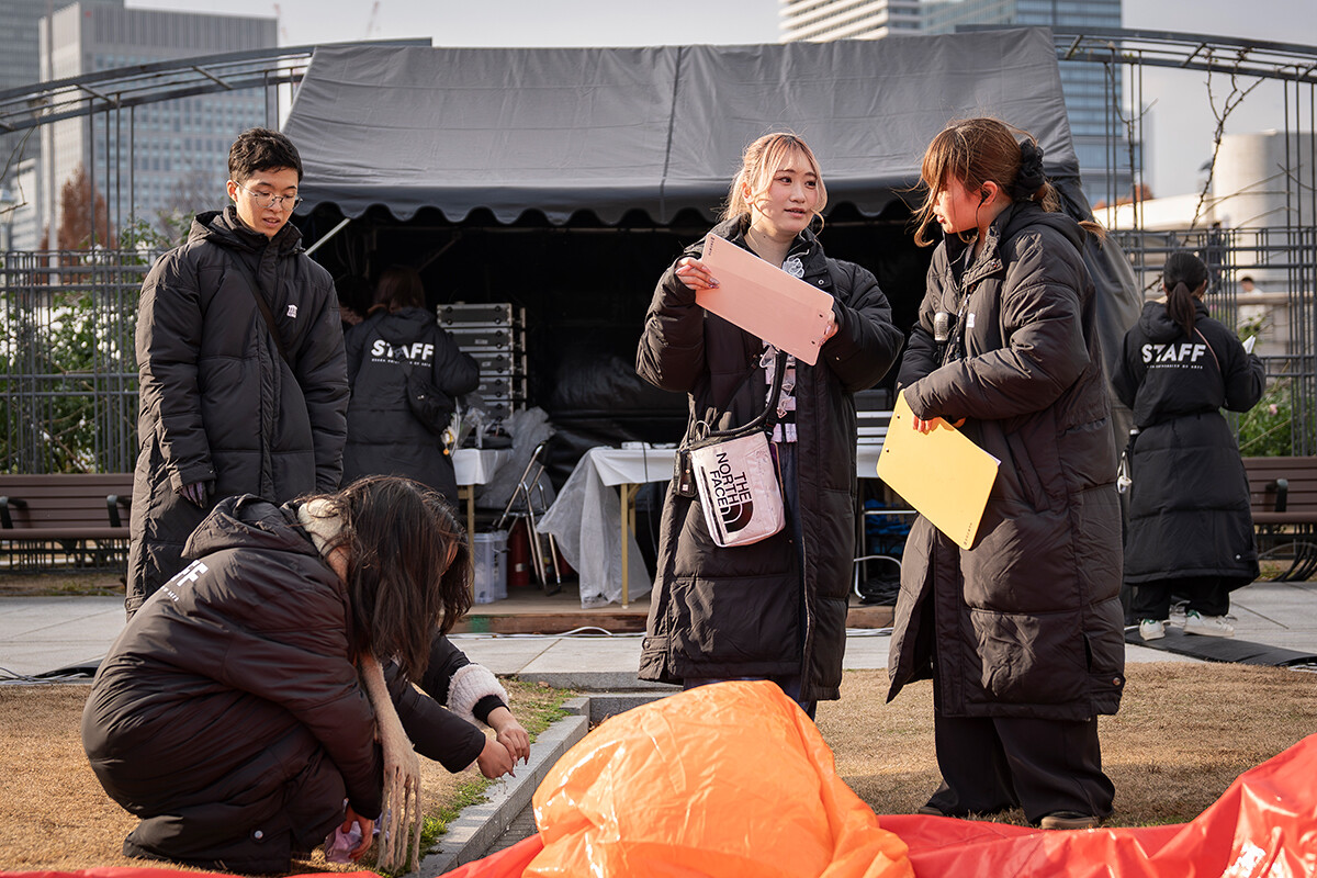 一方で「DINO☆FANTASIA」の舞台裏には、学生たちの日々の奮闘もあります。開幕前日には雨が降り、開幕当日にかけて強い風が吹くなど、天候的に大変な状況下で準備が進められました。それでも学生たちは定刻通りの「17時開場」に向けて、責任感を持って動いていきました。全体ミーティングでは役割分担を再確認し、「ブルーシートにたまった雨水が機材にかからないように」「球体バルーンやエアチューブは強風が吹くと危険な場合があるので逐一、小型風速計の確認を」など注意事項を共有。それぞれが気づいた点や改善点は日報に書き込まれ、ブラッシュアップに努めます。開場後も、サンタ帽をかぶった学生スタッフが順路に立ち、来場者をスムーズに誘導。先生方のバックアップのもとに、企画・制作・運営のすべて学生たちが協力し合って進行していきました。