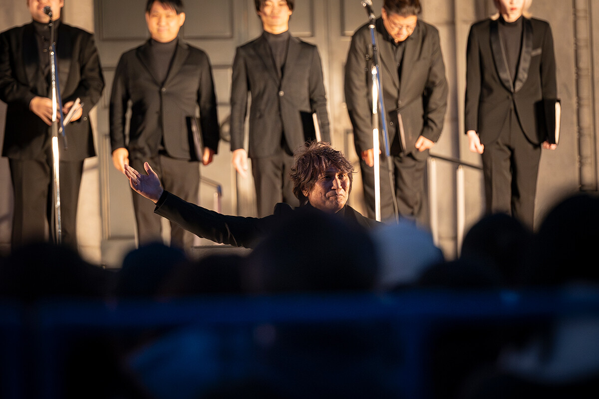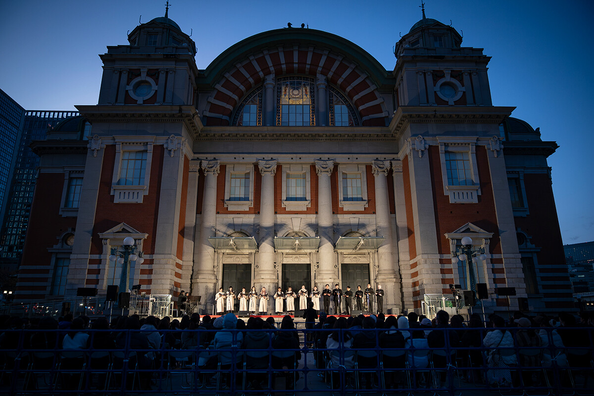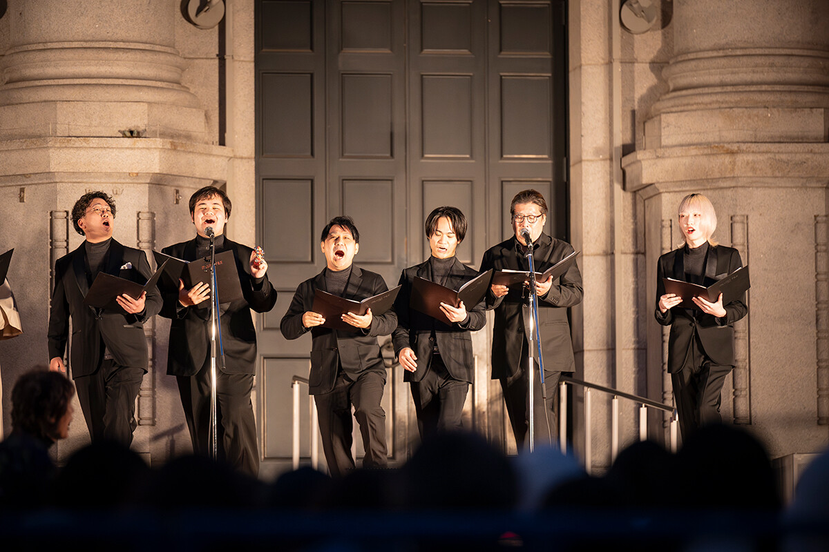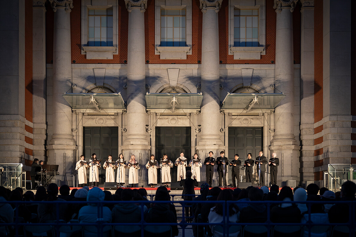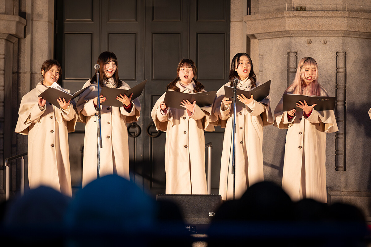 加えて「OSAKA光のルネサンス2025」の開幕を告げる大阪市中央公会堂壁面プロジェクションマッピング初回上映セレモニーのトップバッターという大役を担ったのも、大阪芸術大学演奏学科声楽コースの学生たちでした。多くの来場者の前で「Christmas Carols」の歌唱を披露。「Silent Night」「Santa Claus Is Coming to Town」などを夜空の下で響かせ、大きな拍手を巻き起こしました。このように「OSAKA光のルネサンス」の各所で大阪芸大生の活躍が見られました。