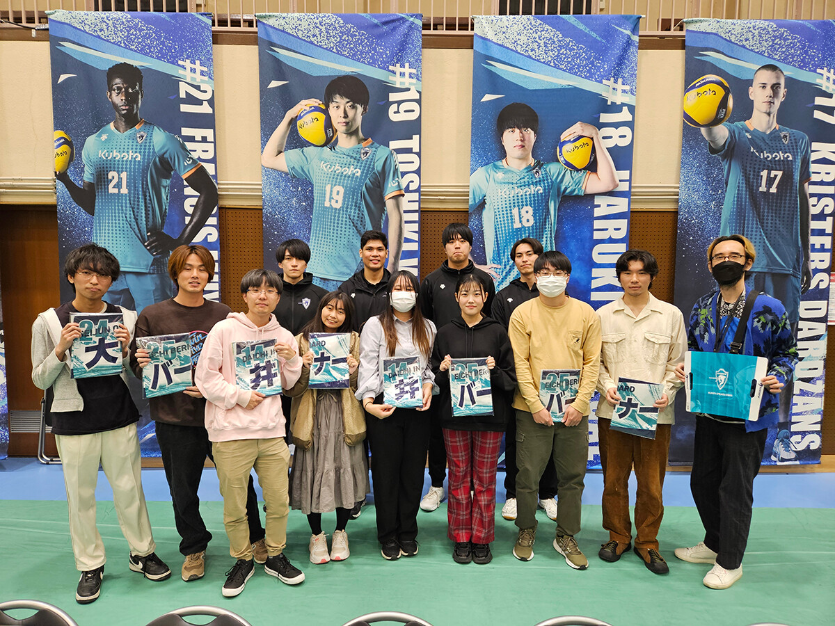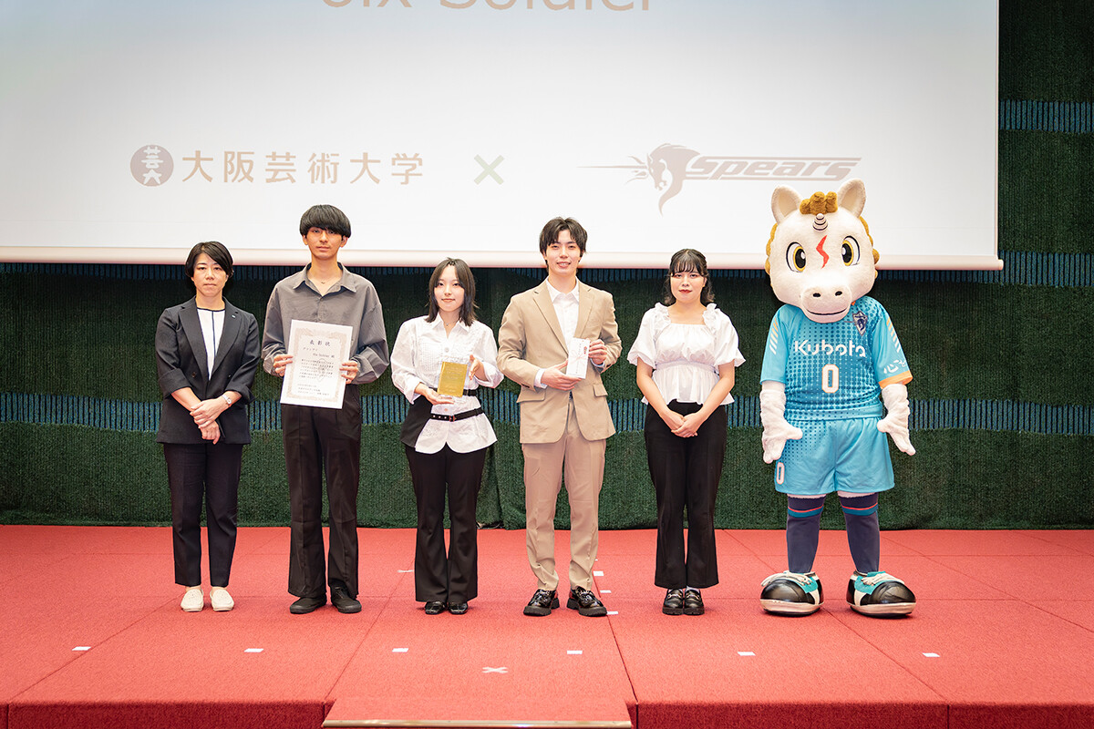 プロバレーボールチーム「クボタスピアーズ大阪」×大阪芸術大学の産学連携プロジェクトとして、公式チームソングコンテストが実施され、演奏学科ポピュラー音楽コースの学生たちが楽曲制作に取り組みました。応募作の中から、学生5人ユニット「6ix Soldier」の作品がグランプリを受賞。2025年9月11日に大阪市浪速区のクボタ本社にて表彰式が行われ、公式チームソング「Color Your Future!~繋がる想い~」が生歌唱で発表されました。また12月7日、Asueアリーナ大阪(大阪市中央体育館)で行われた同チームの公式戦で、ファンに向けて初披露されました。