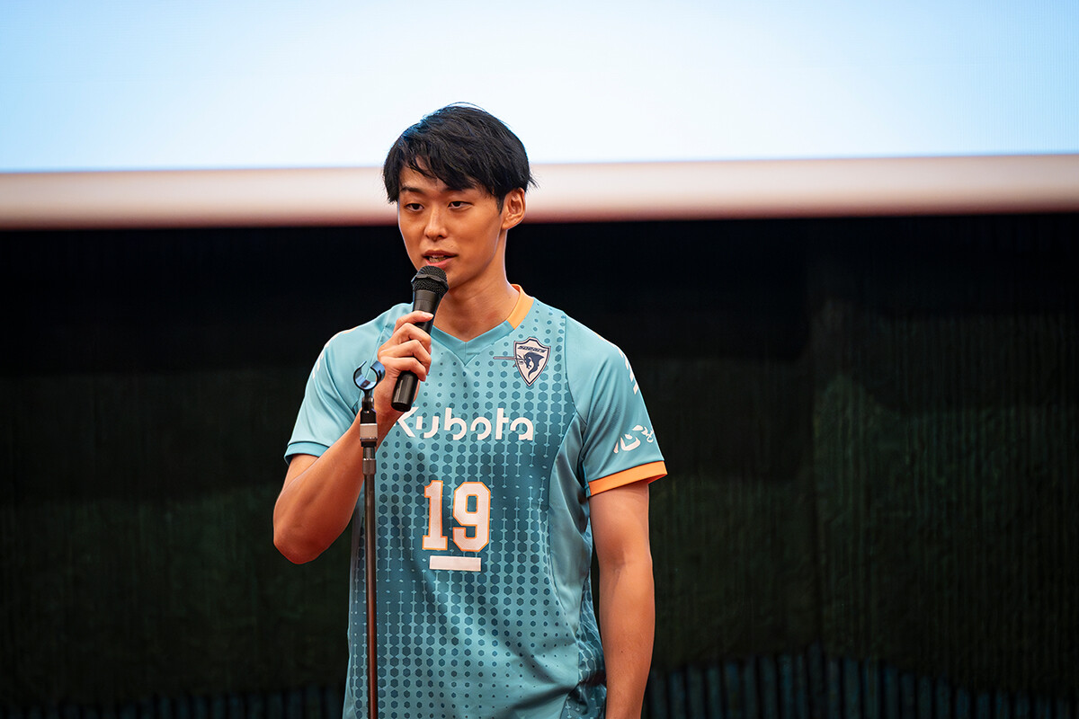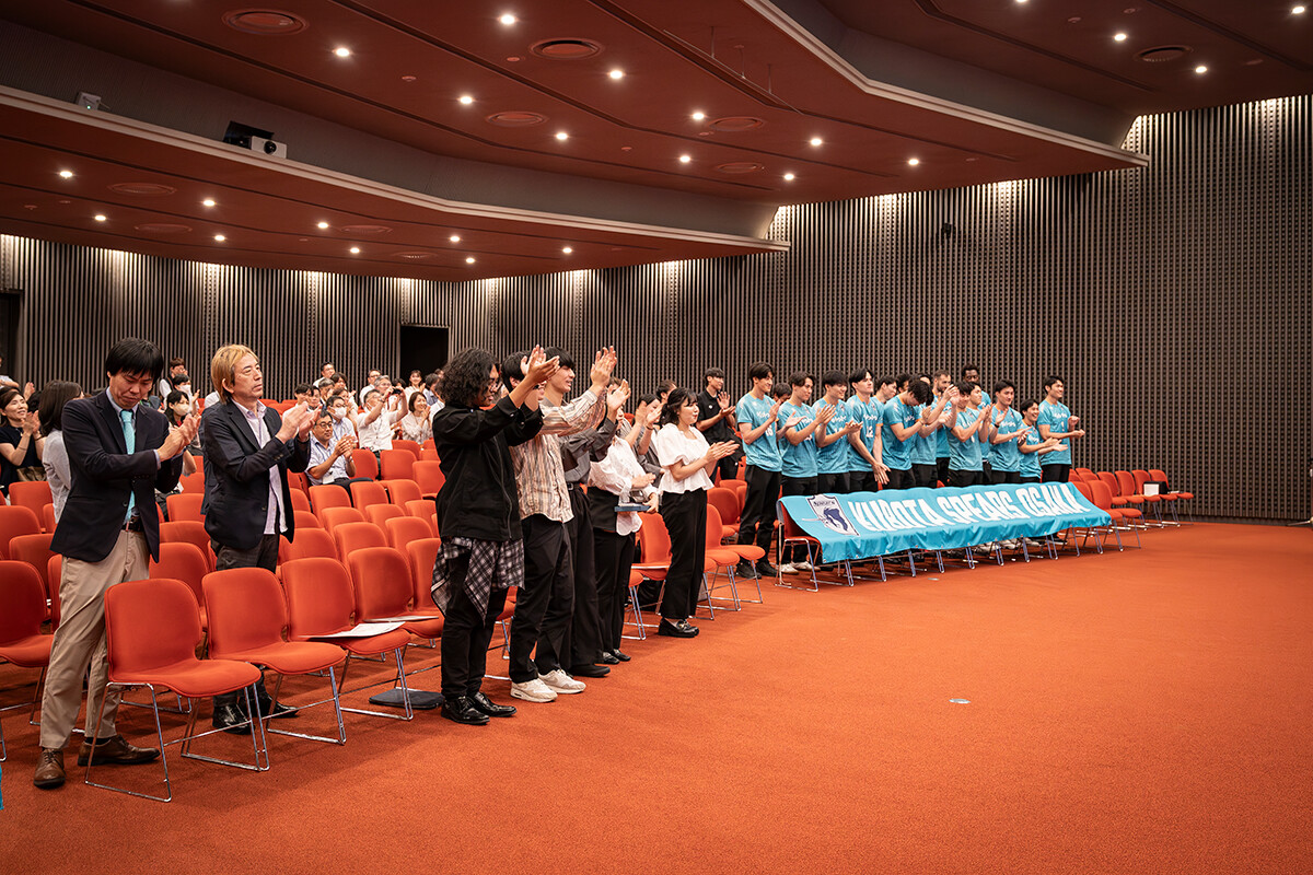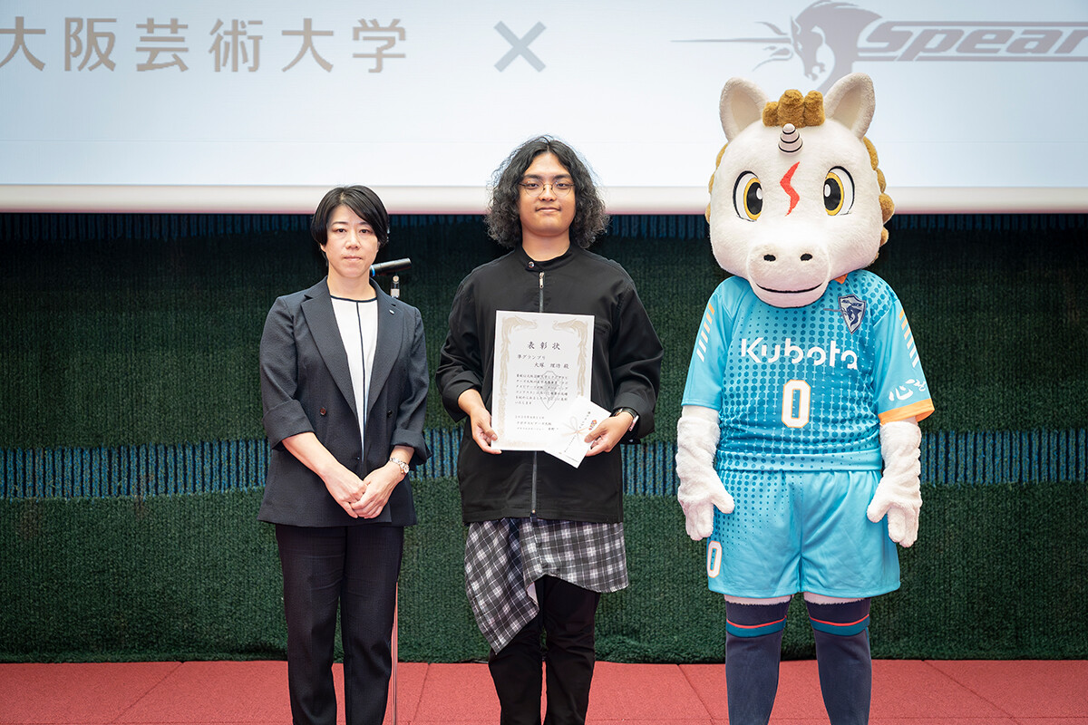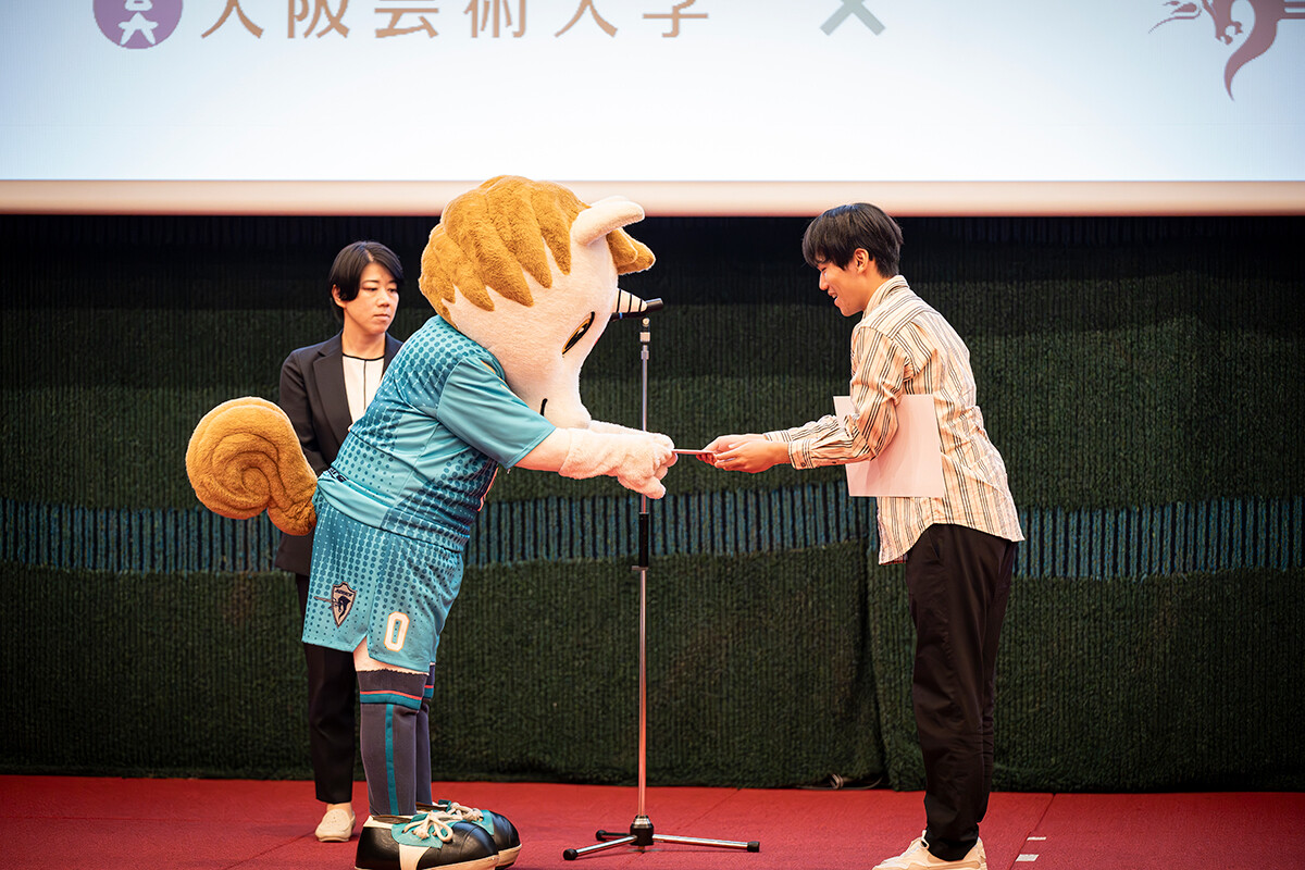 ゼネラルマネージャーの中野さんが「ファンとの一体感を高め、士気を向上させるために大阪芸術大学との連携を決めました。どの作品も素晴らしく、選考は非常に難航しました。このチームソングを胸に、チーム一丸となってリーグ優勝をめざします」と挨拶。その後、準グランプリの大塚理功さん、藤野圭さん、グランプリの「6ix Soldier」メンバーが登壇し、表彰状と副賞が授与されました。