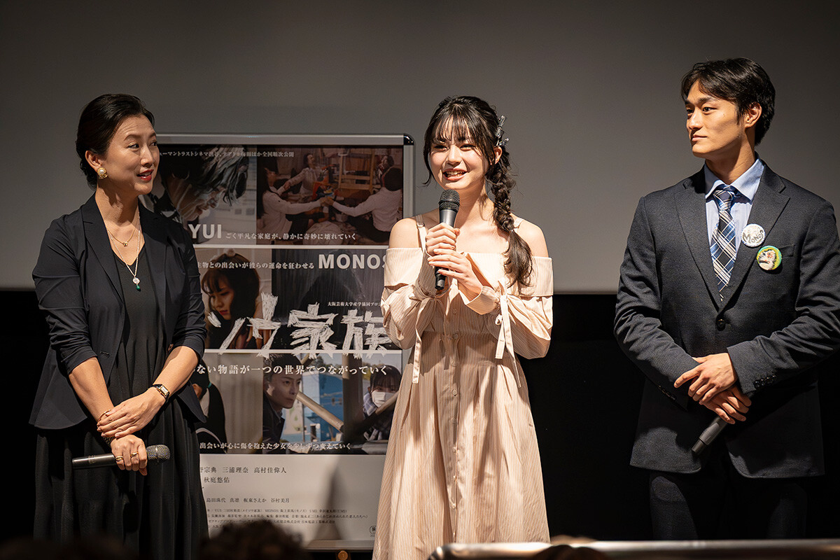 大阪芸大の「産学協同プロジェクト」で完成した映画が全国公開されるのは、これが初めてのこと。秋庭さんは「天にも昇る気持ちです。自分の名前が残るように4年間を過ごそうと思っていたので、それが実現できてすごく幸せです」と喜びを爆発させます。そして舞台挨拶の最後に熊切監督が「純粋な気持ちで映画を撮ることができました。どうぞ楽しんでください」と呼びかけると、金田先生は「大阪芸術大学の舞台芸術学科には『おっ』と思う学生がいっぱいいます。もっと外に向けて発信したらいいのに、という学生もたくさんいます。今回は秋庭くんをキャスティングしましたが、これが一つのきっかけになってほしいです」と学生たちの今後のがんばりに期待を寄せました。