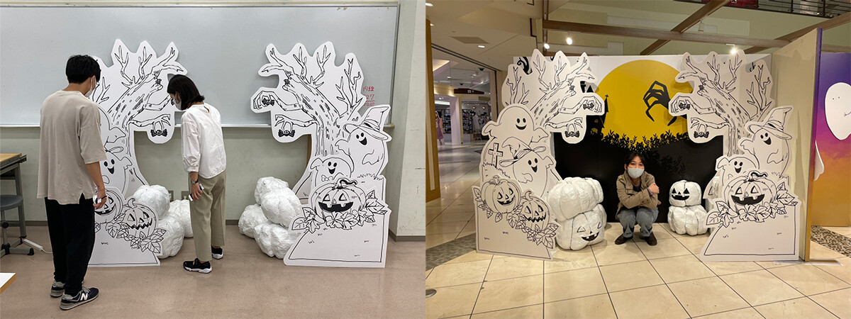 授業外でもZoomやLINEなどを使って会議を重ね、天王寺ミオのハロウィンプロモーション担当の方々にアドバイスを頂きながら、どうしたらコロナ禍の中で天王寺ミオに訪れる方々に楽しんでいただけるかを考えました。