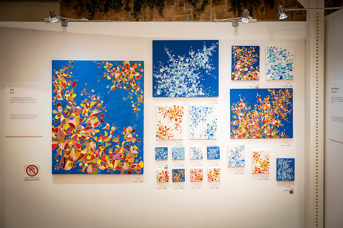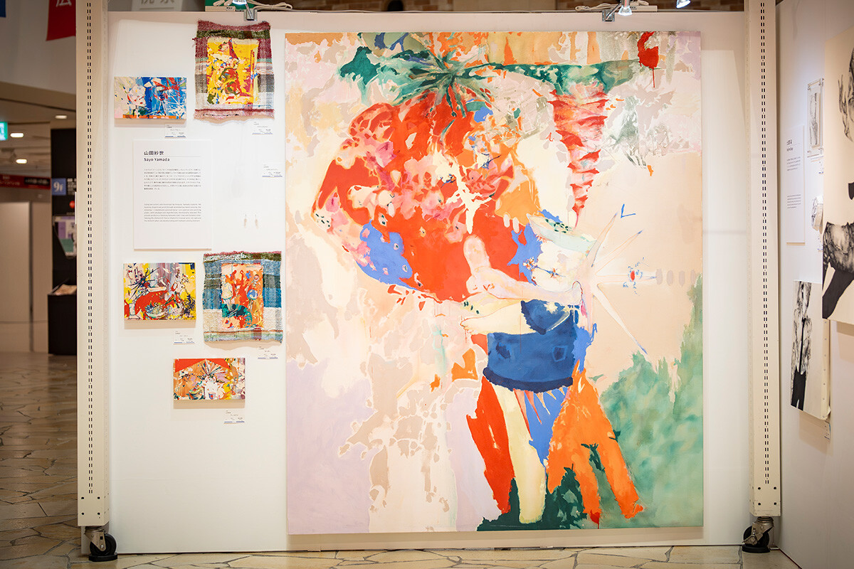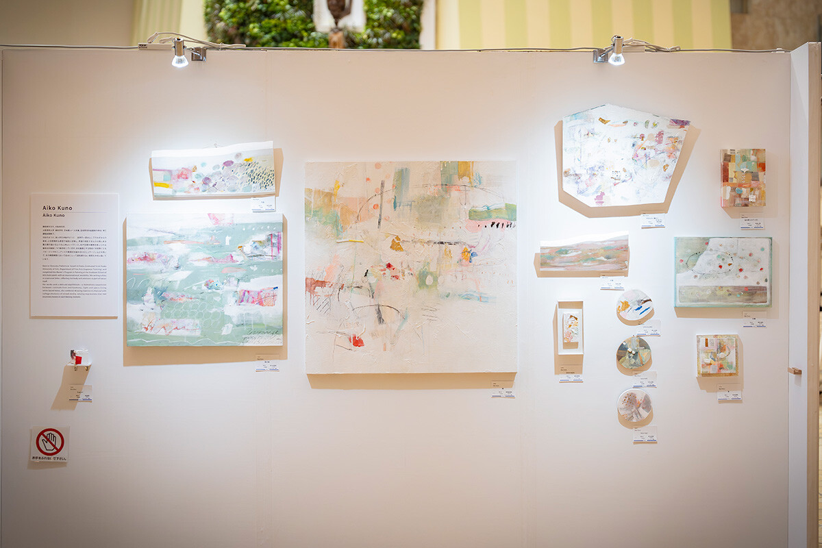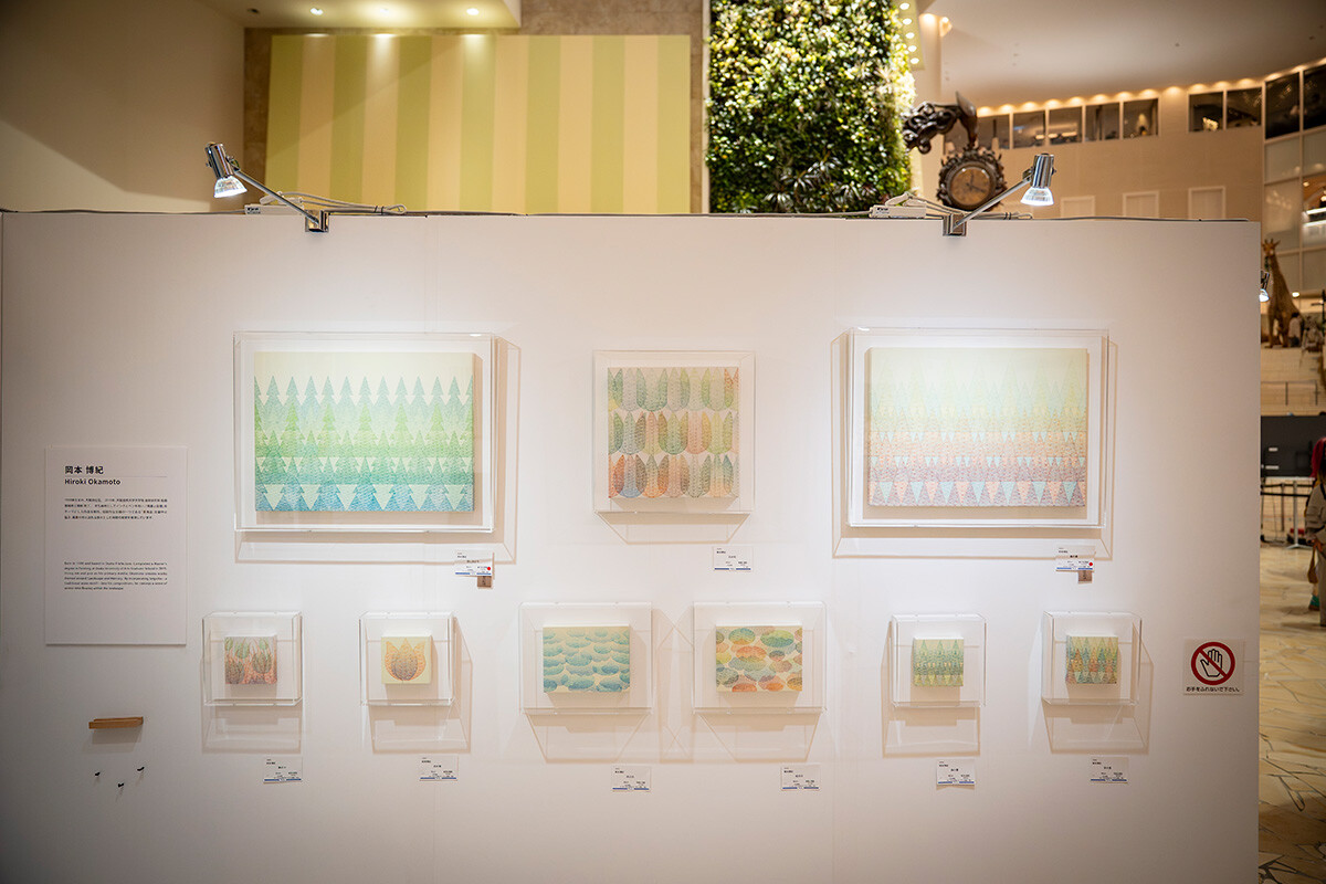 美術学科出身のAiko Kunoさん、朝井颯志さん、岡本博紀さん、笠原彰人さん、﨑新谷萌夏さん、ハッピーモンスター横岑竜之さんの展示は、まさに表現の多様性を体感できるラインナップ。鮮やかな色彩に木炭などでドローイングのニュアンスを添えた絵画、幻想的な世界に誘われる緻密な銅版画、伝統的な文様で「風景と記憶」を描いたペン画、様々な花など数多くのモチーフが絶妙に調和する作品、無数の点がヴェールのように画面を覆う抽象画、強烈なオリジナルキャラクター作品など、それぞれの探求の成果が息づいていました。