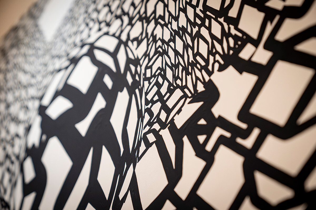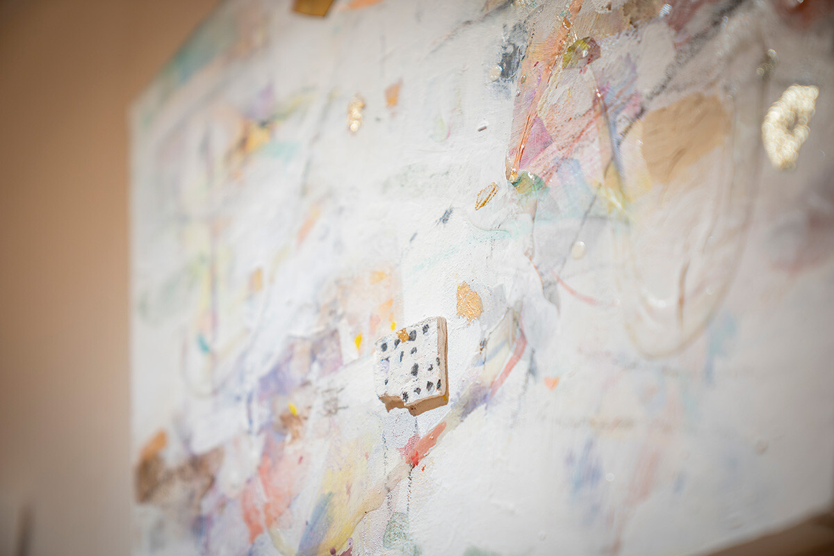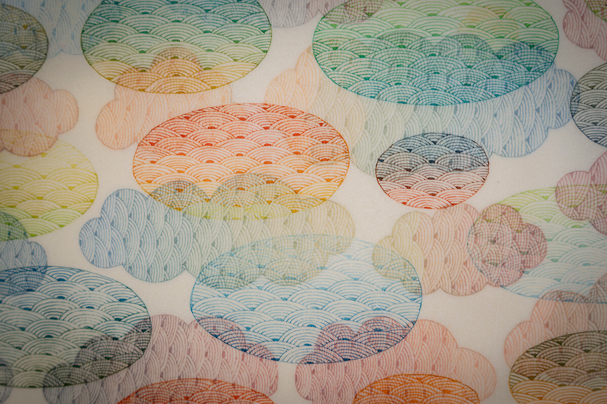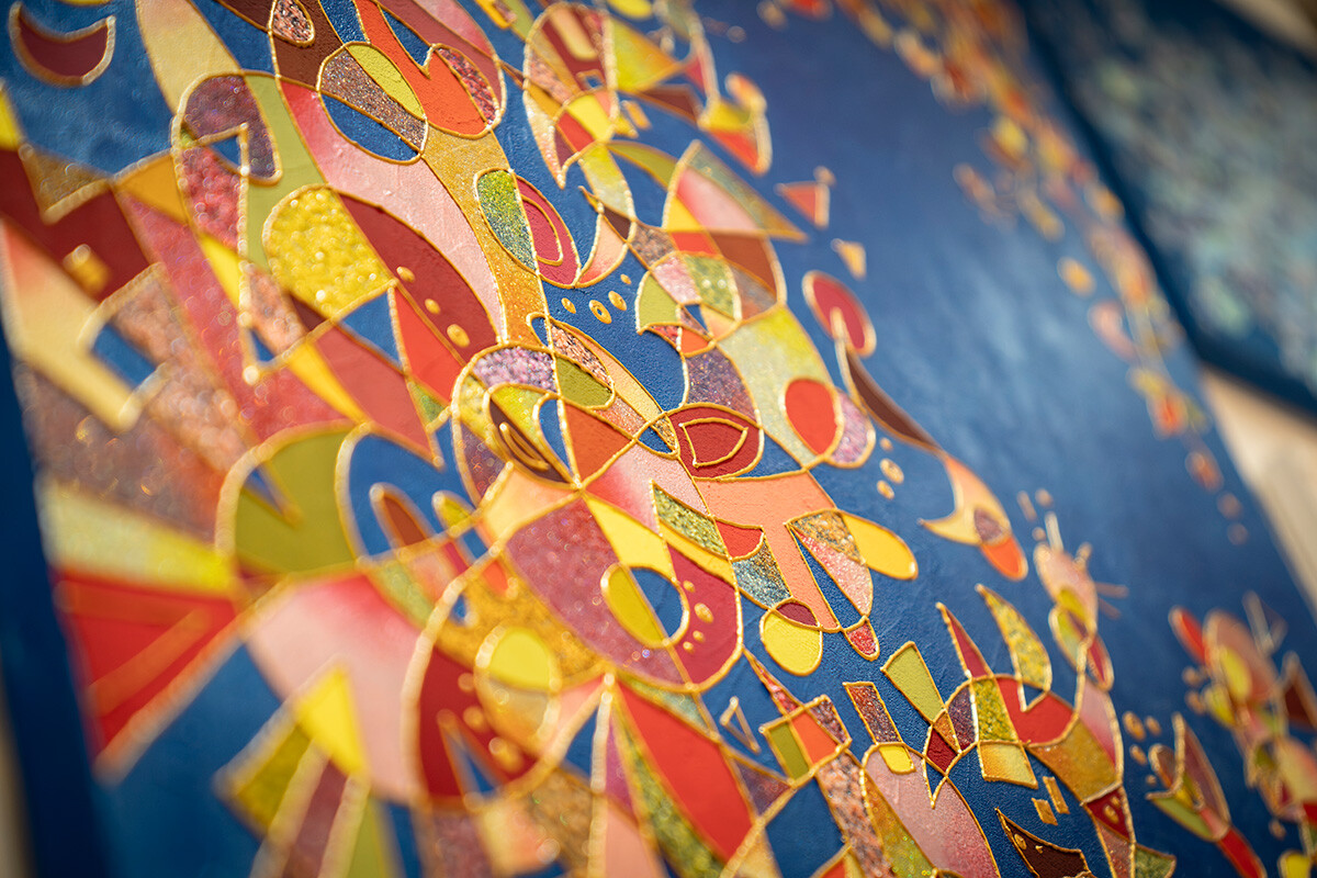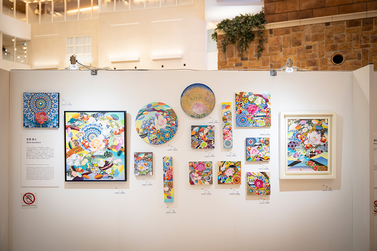 美術学科出身のAiko Kunoさん、朝井颯志さん、岡本博紀さん、笠原彰人さん、﨑新谷萌夏さん、ハッピーモンスター横岑竜之さんの展示は、まさに表現の多様性を体感できるラインナップ。鮮やかな色彩に木炭などでドローイングのニュアンスを添えた絵画、幻想的な世界に誘われる緻密な銅版画、伝統的な文様で「風景と記憶」を描いたペン画、様々な花など数多くのモチーフが絶妙に調和する作品、無数の点がヴェールのように画面を覆う抽象画、強烈なオリジナルキャラクター作品など、それぞれの探求の成果が息づいていました。