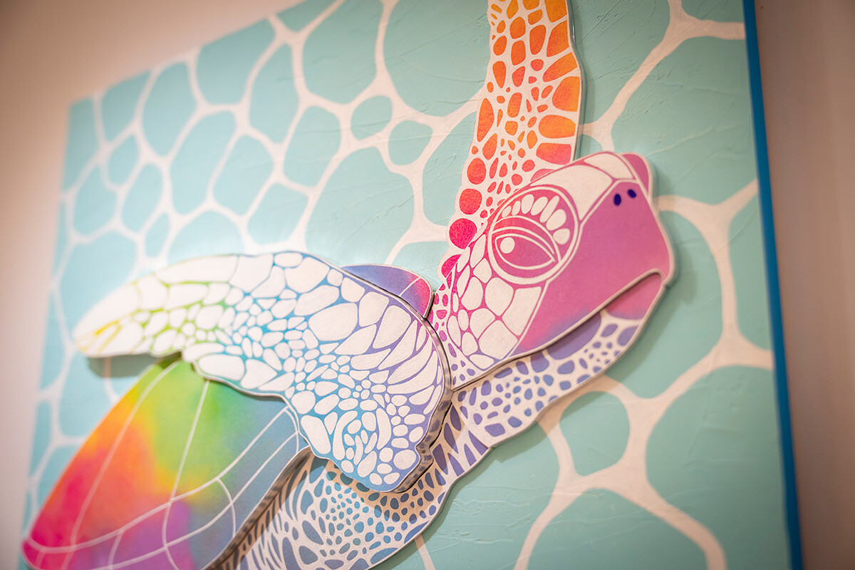 また、井下彩乃さん、イユダエマさん、ピトさん、MINAMI MIYAJIMAさんはデザイン学科、山田紗世さんは大阪芸術大学短期大学部デザイン美術学科出身。動物の半立体アート、可愛いポップな作風の中にダークさがひそむ作品、ラメやアクリル絵の具でリズミカルに描いたカラフルなアート、四角形が密集する幾何学的なモノトーン作品、手彩色を加えたシルクスクリーンなど、多彩な技法が会場に華やぎを添えていました。