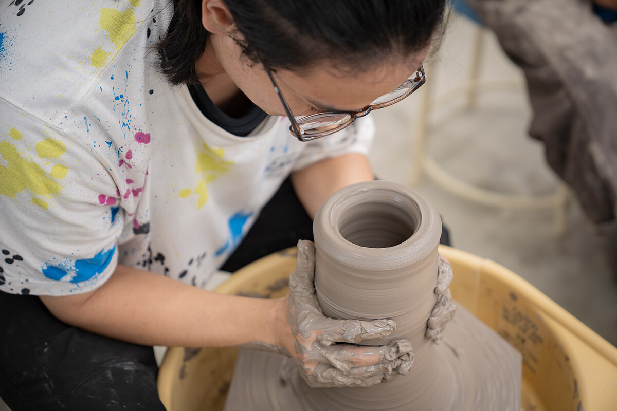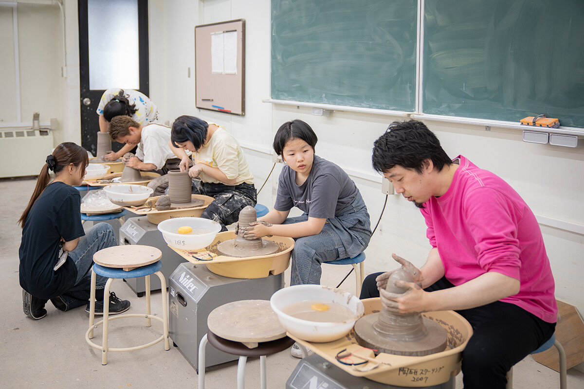 僕は大阪芸大のオープンキャンパスで初めて工芸にふれ、面白さに惹かれて入学しました。1年次に4つのコースを体験した上で、2年次から陶芸を専攻。陶芸は思い描いたものを最も自由に形にすることができ、造形に必要な制約もふまえながら工夫を重ねるプロセスが、自分の性格にも合っていると感じています。工芸コースの先生方は、制作面だけでなく将来の進路についても親身に相談に乗ってくださる心強い存在。施設や人の面でも、とても恵まれた環境で学べています。