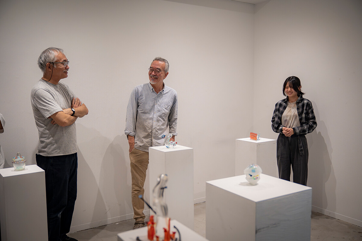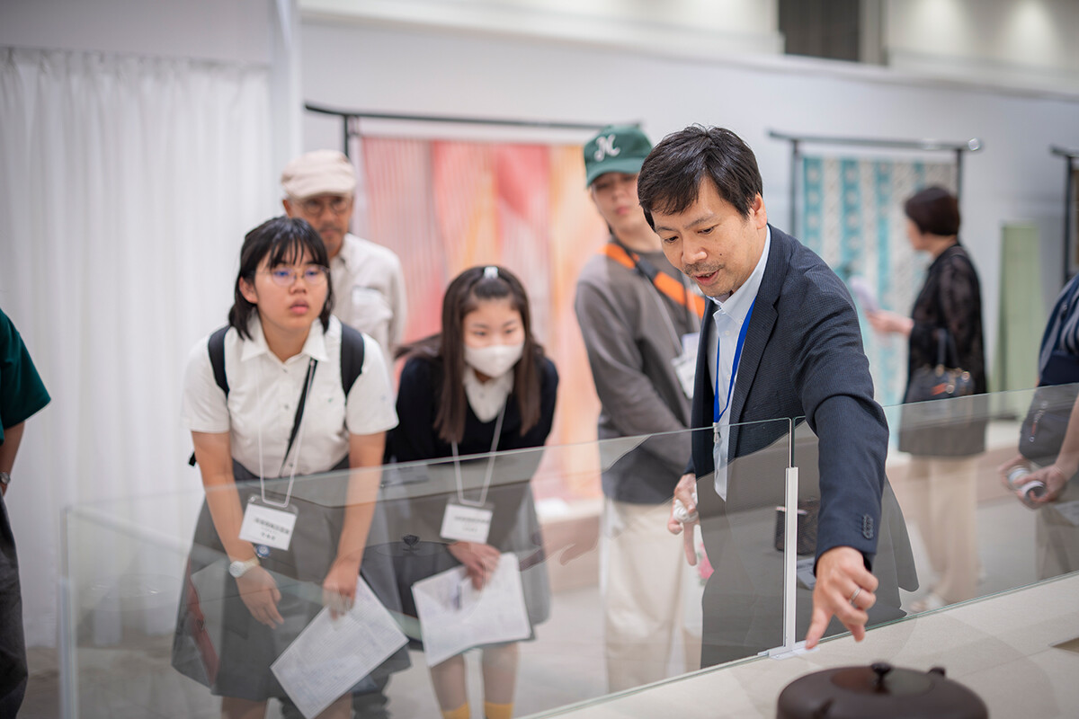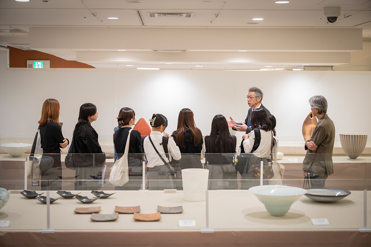 参加者は少人数のグループに分かれて見学。陶芸作家の樋口邦春さん、染織作家の宮入映さん、金工作家の角谷圭二郎さん、ガラス作家の井住哲司さん、截金作家の藤野聖子さんらが、それぞれの分野の作品について丁寧にレクチャーしてくださり、素材の特性や技法、制作工程など、表面的な鑑賞だけでは知ることのできない部分まで学びました。