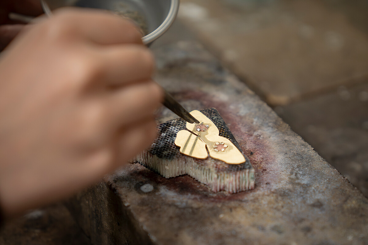 裏側からのロウ付け作業。経験者は少し複雑なデザインに挑戦するなど、個々のレベルに合わせた作品に