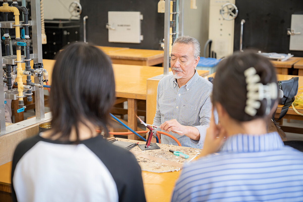 金属工芸コースでは、まず古来の基本技術を修得し、それを自分の感性で表現することを大切にしています。素材に敬意を持って向き合う姿勢は、工芸の基盤であり、かたくなで動かない素材と対峙することで、人は自然と謙虚にならざるをえません。ものづくりの本質を学びながら、共同作業や周囲への気配りなど、人間力も育まれていきます。その意味で工芸学科は実は「人づくり」の場でもあります。大阪芸大のおおらかな校風の中で、のびのびと制作に励める環境が、学生たちの成長を力強く支えていると思います。