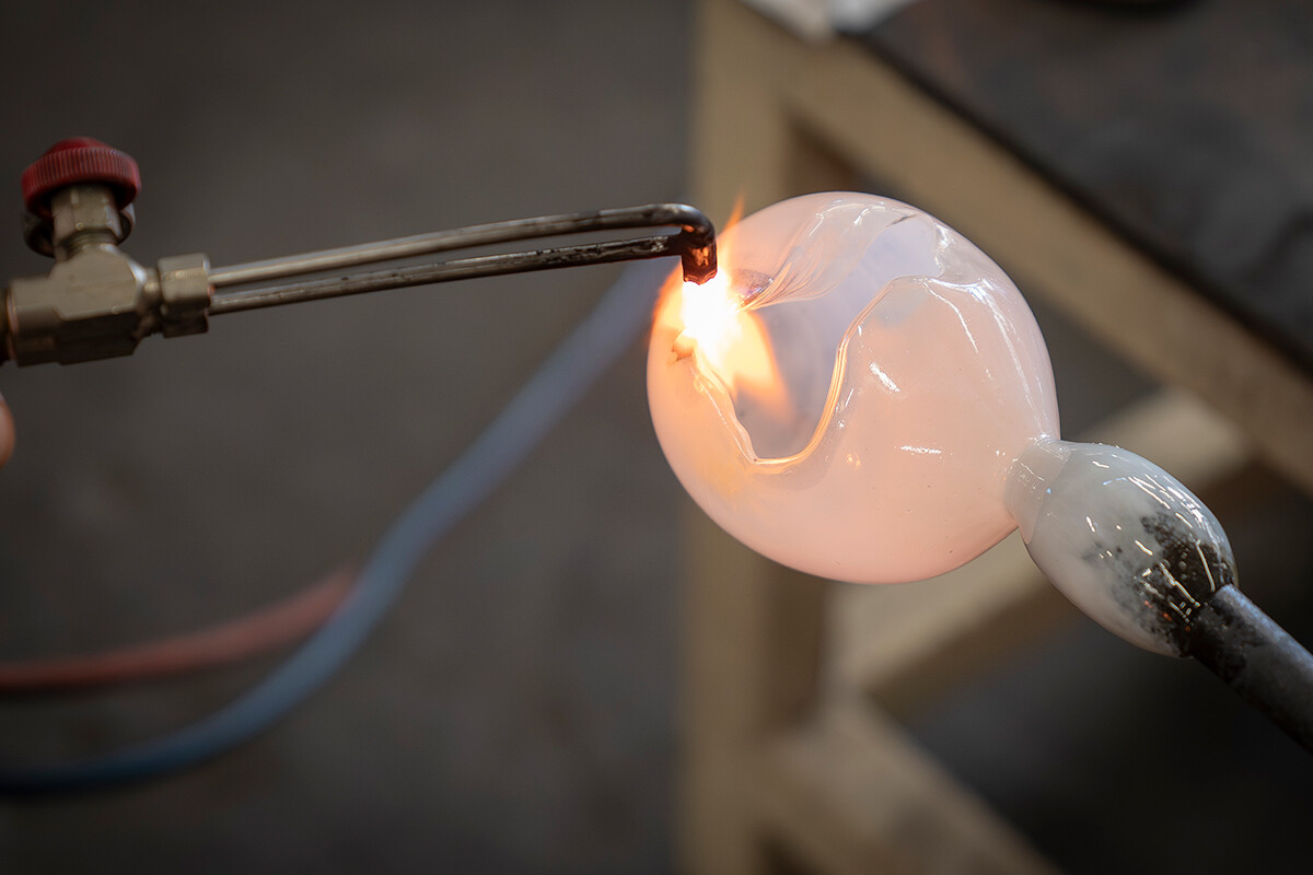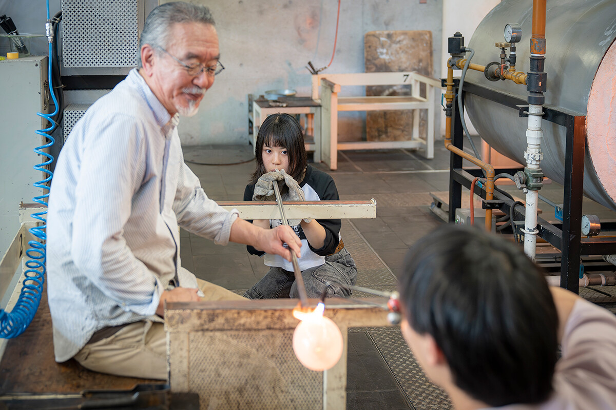 工房の焼成炉を使い、吹きガラスにも挑戦。高温のガラスが刻々と変化しながら見せる造形美を体験
