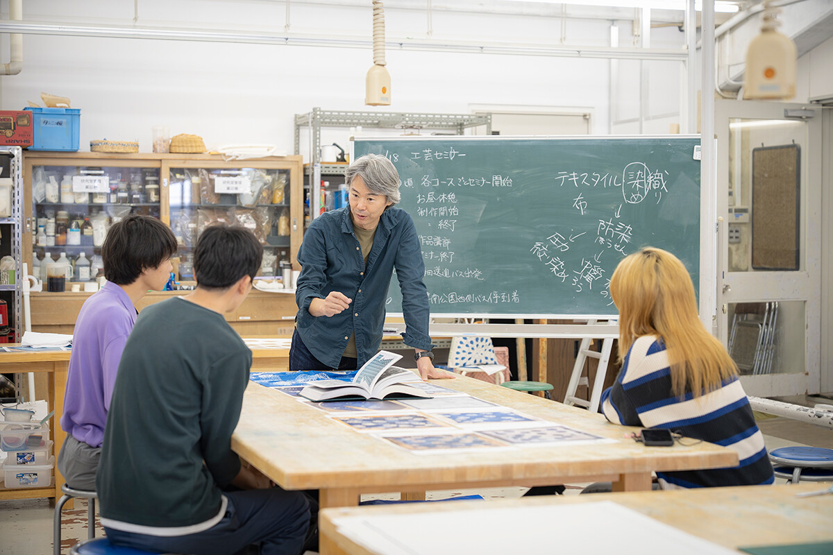 テキスタイル・染織コースでは、染色家で工芸学科准教授の舘正明先生が指導にあたり、スカーフの藍染作品に取り組みました。この課題の出発点は、「日本伝統工芸展」にも展示されていた人間国宝・森口邦彦氏の着物作品。高度な「まき糊」技法に着想を得て、「まきろう」技法を取り入れた制作に挑戦しました。