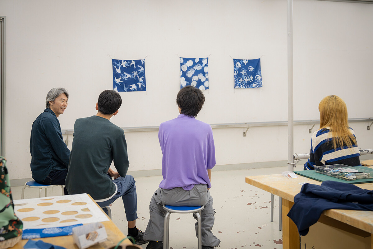 テキスタイル・染織コースの講評会。作品を鑑賞し合い、感想や工夫した点を共有することで、制作の楽しさがさらにふくらむ