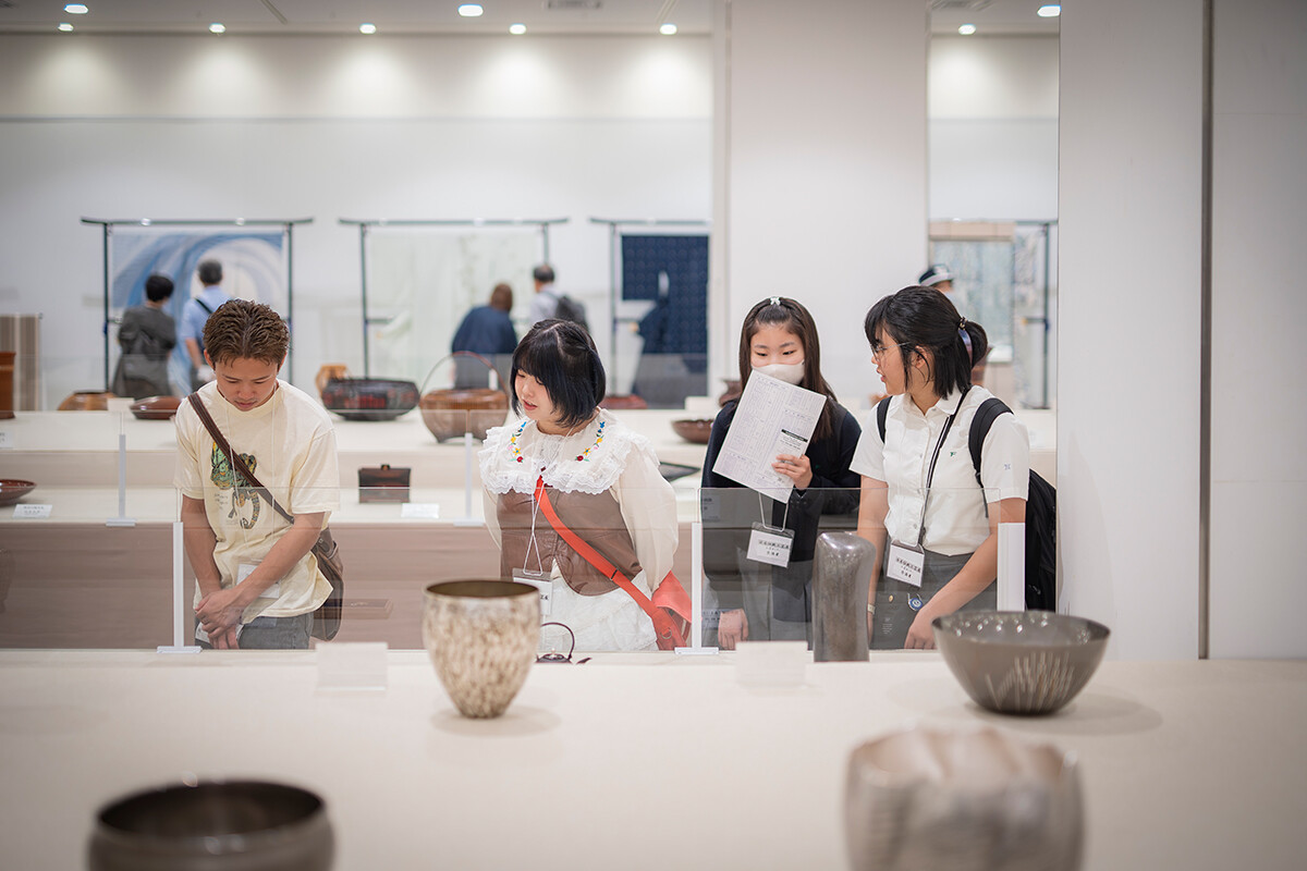 今回の特別工芸セミナーは、大阪髙島屋にて2025年10月16日~21日に開催された「第72回 日本伝統工芸展 大阪展」と連動し、2日間のプログラムで行われました。工芸に興味を持つ高校生と、工芸学科の学生・教員らが参加。1日目は作家の先生方の解説を伺いながら、多彩な伝統工芸品を鑑賞しました。